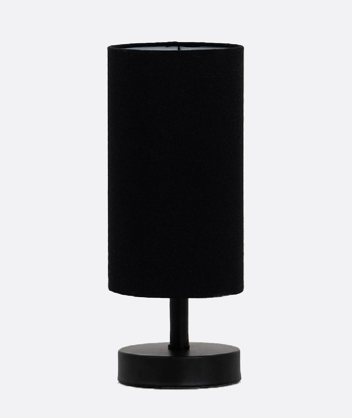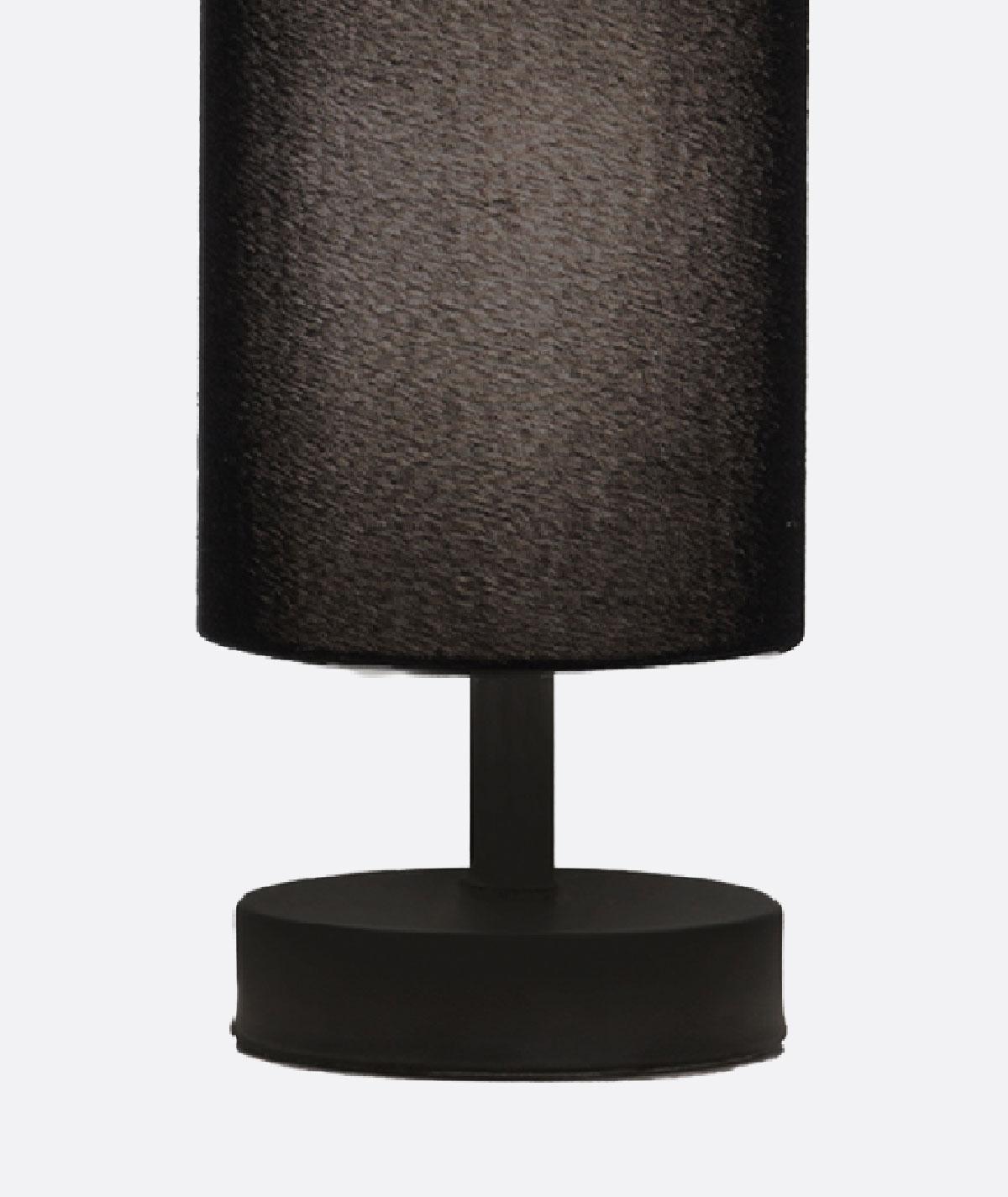 Minimalist table lamp with a cylindrical black fabric shade and a sleek black metal arm. Provides soft ambient lighting, perfect for bedrooms, living rooms, or modern workspaces.