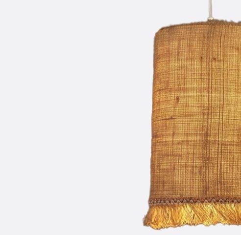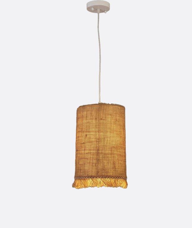 YL-P-210-A stylish pendant lamp that blends natural texture with artistic flair. The cylindrical shade is made of woven material, offering a warm, organic look, while the golden fringe at the bottom adds movement and a touch of elegance. Suspended from the ceiling by a thin cord and a simple white mount, it emits a soft, warm light that highlights the texture and creates a cozy atmosphere.
