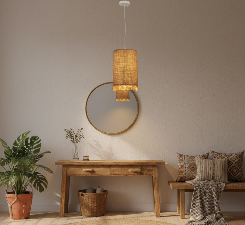 Its style blends natural charm with a bohemian touch, making it perfect for spaces that embrace warmth, simplicity, and handcrafted details like woven textures and decorative fringe.