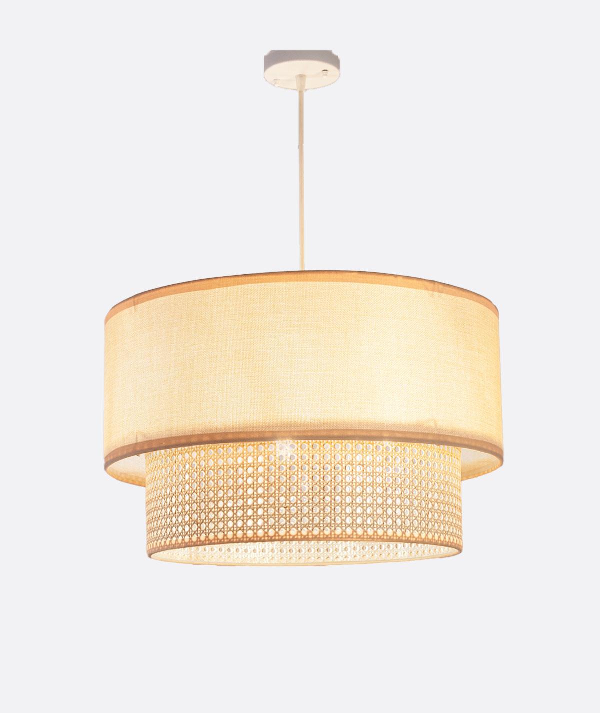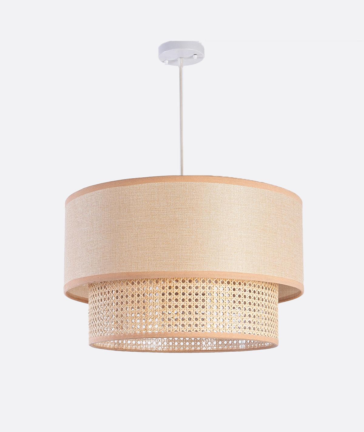 “Shaded pendant light with supported beige linen shade and rattan wood – handcrafted in Egypt. A modern boho pendant lamp perfect for living rooms, bedrooms, dining areas, and terraces, blending warmth and style with eco-friendly design.”