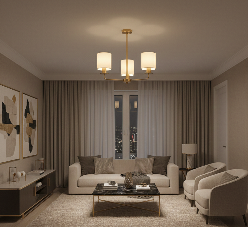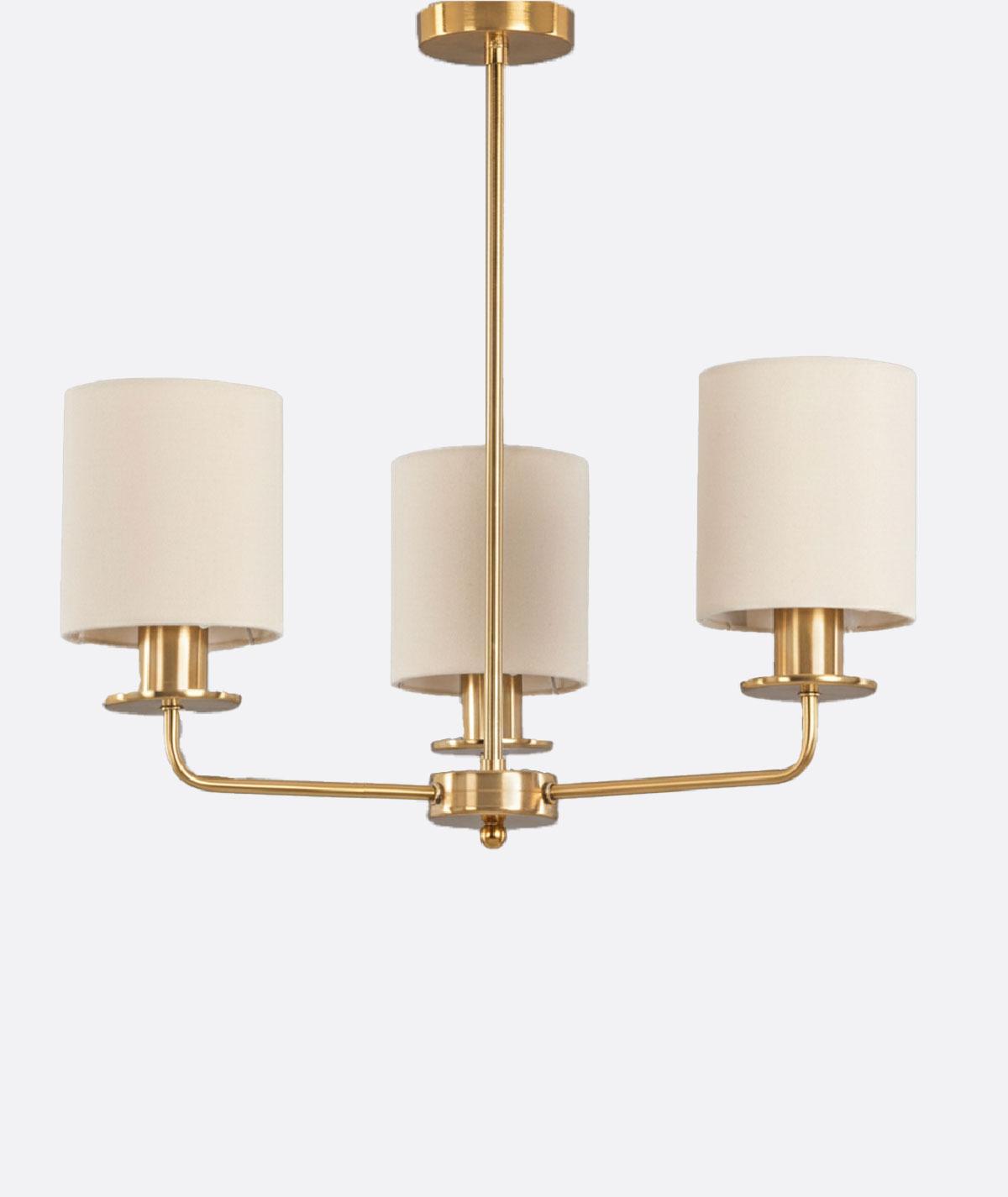 This ceiling light fixture features a sleek modern design that blends simplicity with visual harmony. It consists of three cylindrical beige lampshades connected to a central metallic arm that extends from a circular ceiling mount. Each shade is symmetrically positioned along horizontal arms, giving the fixture a balanced geometric appearance that complements contemporary interior styles. The warm-toned shades provide soft, comfortable lighting that enhances the ambiance without overwhelming the space. This fixture is an ideal choice for living rooms, dining areas, and home offices, offering both functional illumination and a refined decorative touch that adds elegance and serenity to any interior.