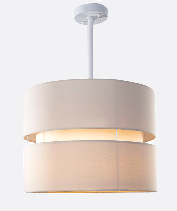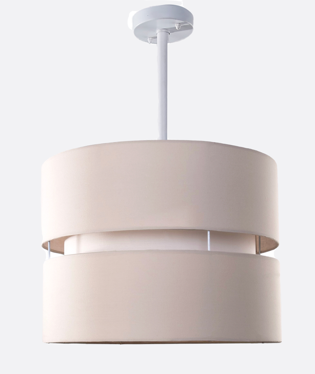 YL-C-32-LBI Contemporary Beige Shaded Pendant Bring contemporary charm to your space with the modern single-shade pendant lamp, featuring three cylindrical cotton shades?two in light beige ?and one in white?supported by a light grey matte steel frame for a stylish accent. Designed to provide warm ambient lighting, it offers downward illumination powered by four E27 bulbs. Ideal for living rooms, bedrooms, and dining areas, its soft, warm glow adds a cozy and inviting touch to any modern interior.