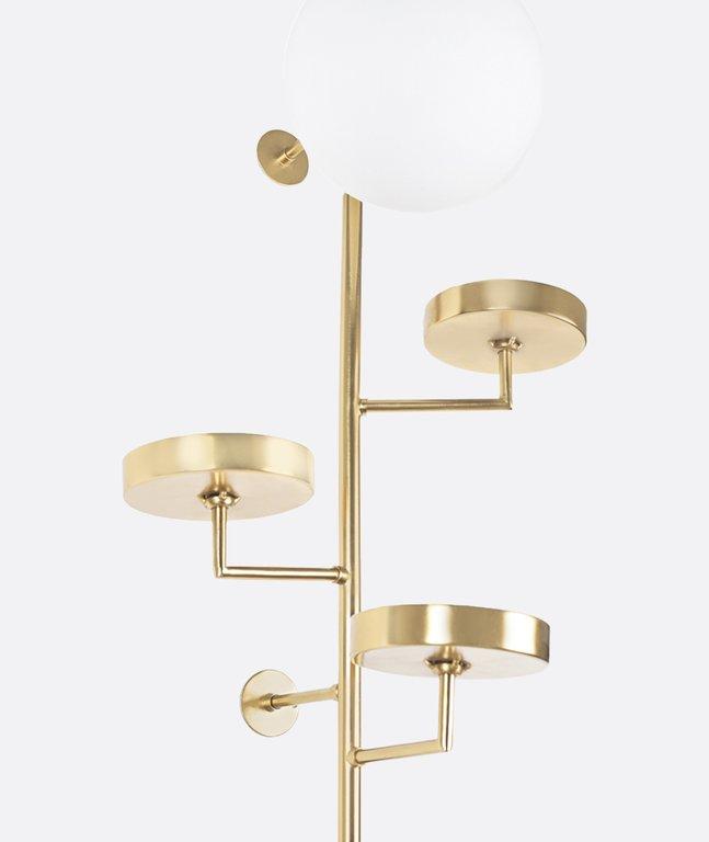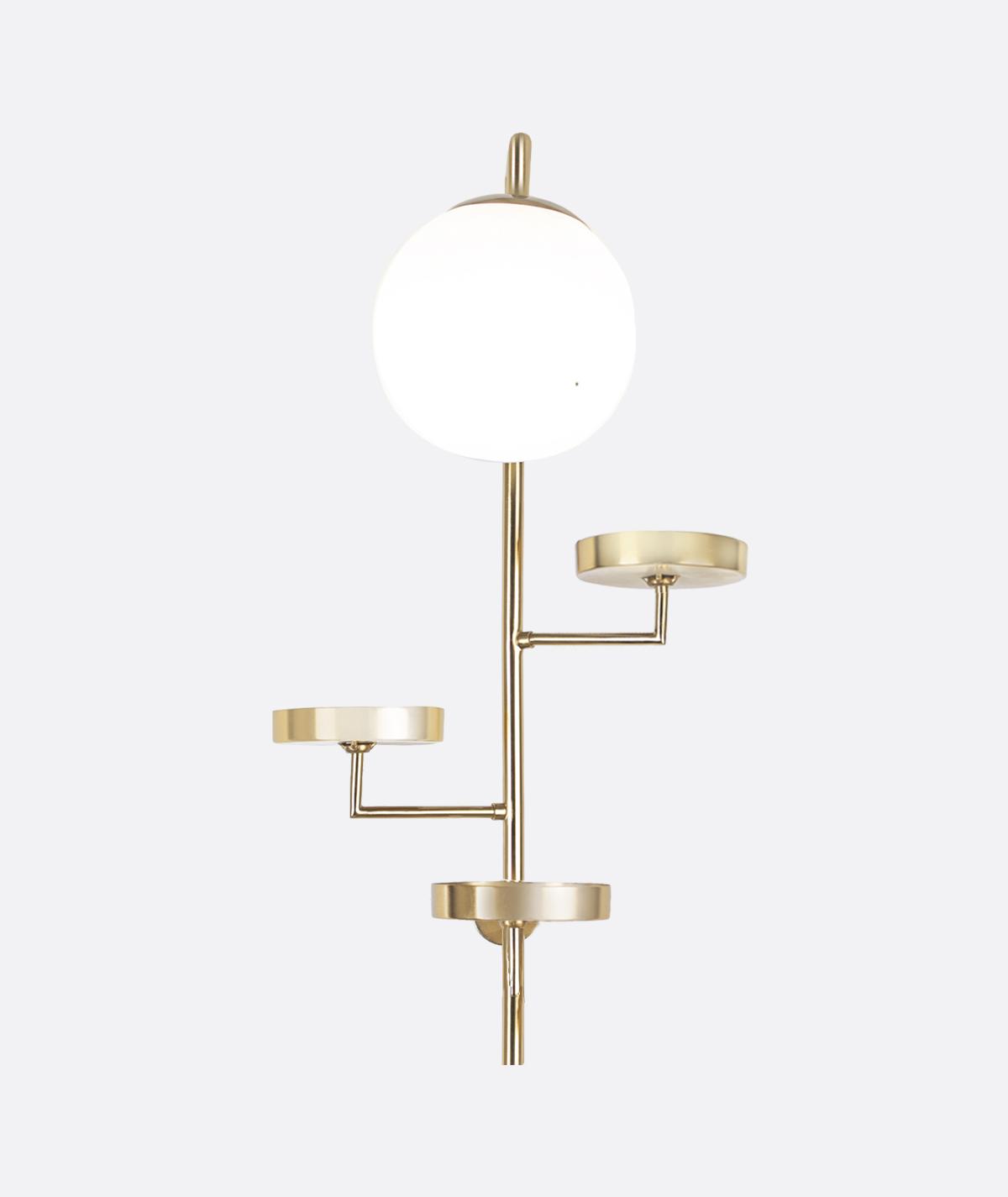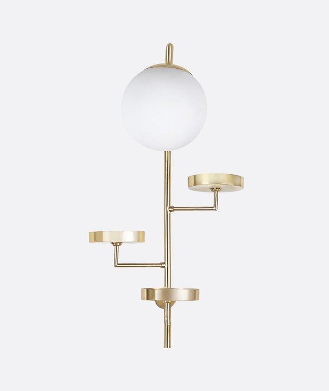 This artistic wall light features a sleek gold metal frame with multiple tiered accents and a white glass globe, blending modern design with sculptural elegance. Its unique structure creates a statement piece that provides soft lighting while serving as a decorative focal point. Handcrafted in Egypt, it adds a luxurious and contemporary touch to living rooms