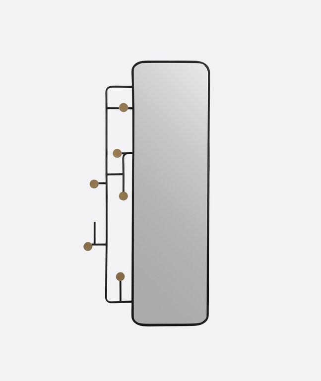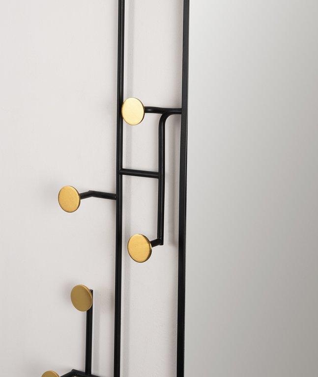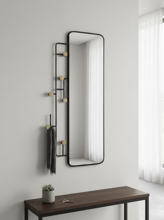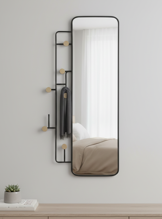 A sleek fusion of form and function, this wall-mounted mirror features a rounded rectangular silhouette framed in black, paired with a sculptural coat rack of intersecting black bars and golden knobs. Ideal for entryways and hallways, it offers both reflective clarity and practical storage. The minimalist design adds a modern touch while keeping your space organized and stylish.