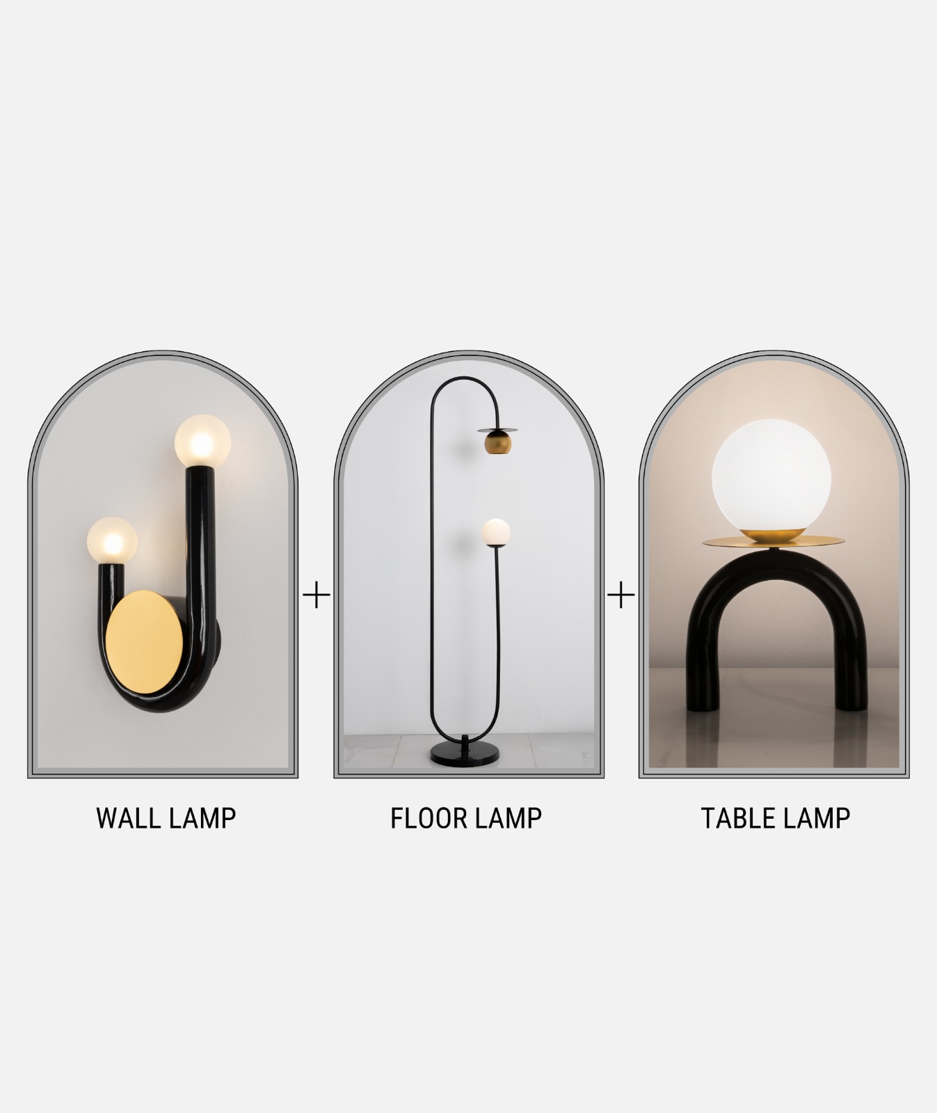• Table Lamp: A compact U-shaped black base supporting a golden disc and a single white globe—perfect for desks, consoles, or bedside tables.