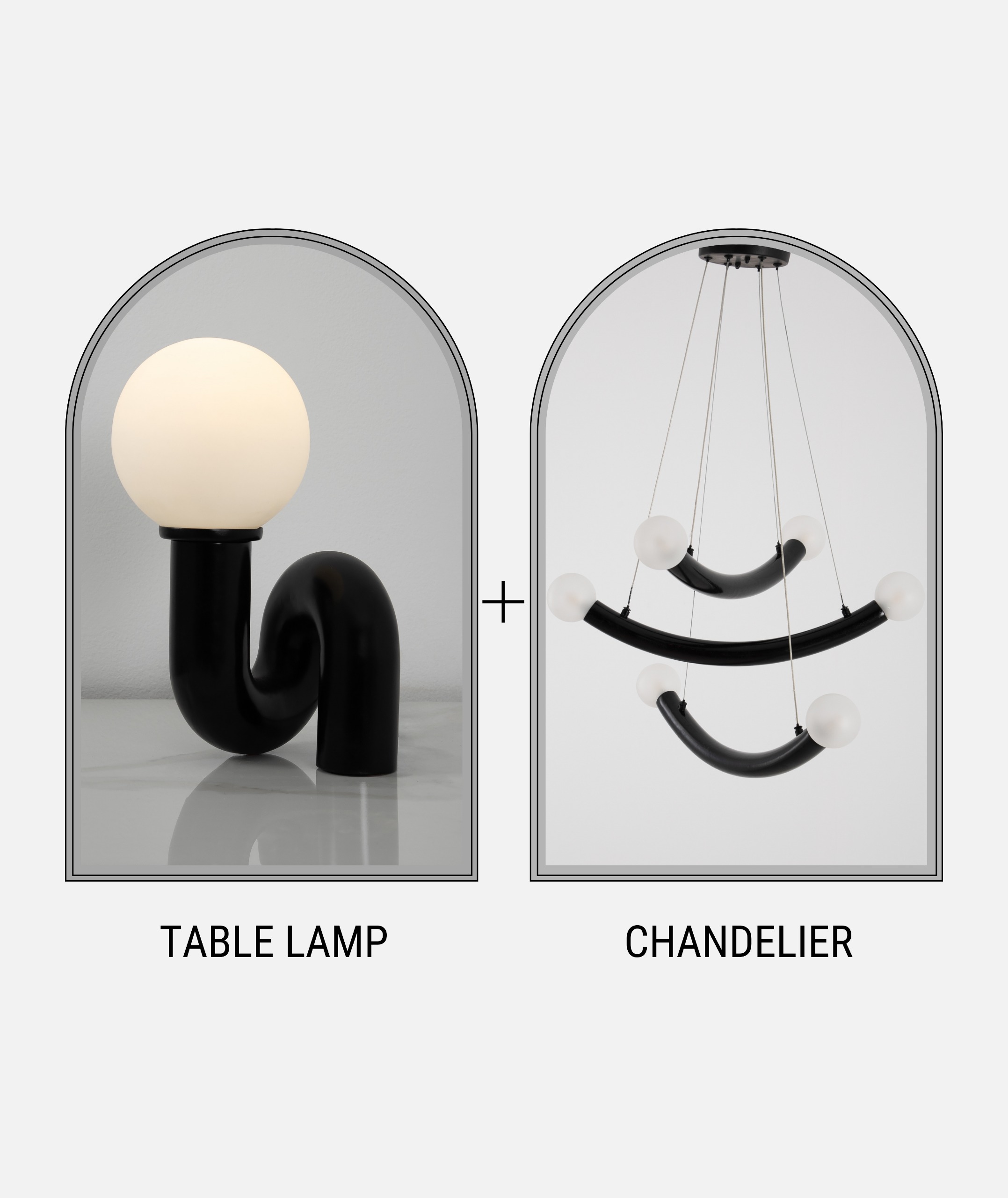 • Table Lamp: A compact black base shaped like a curved pipe, topped with a luminous white globe—ideal for desks, consoles, or bedside tables.