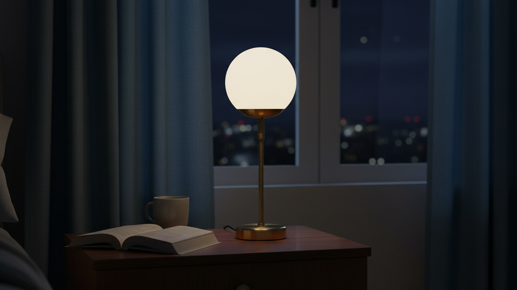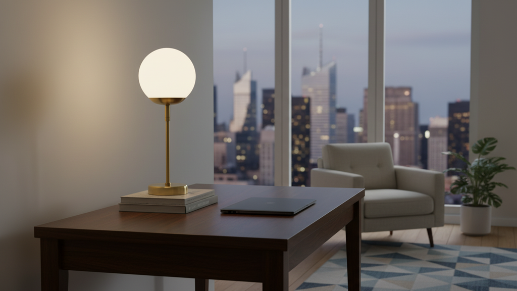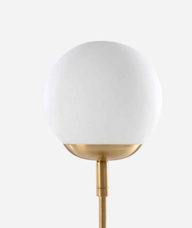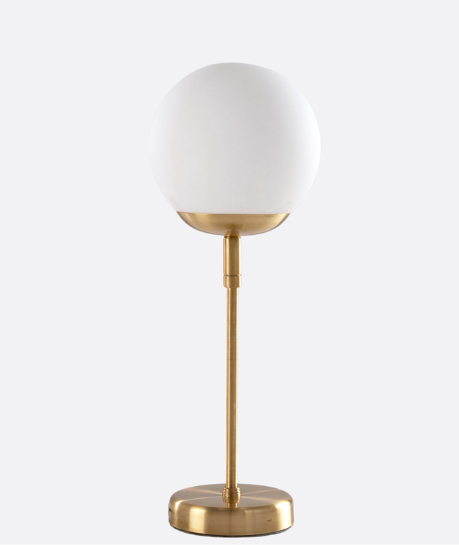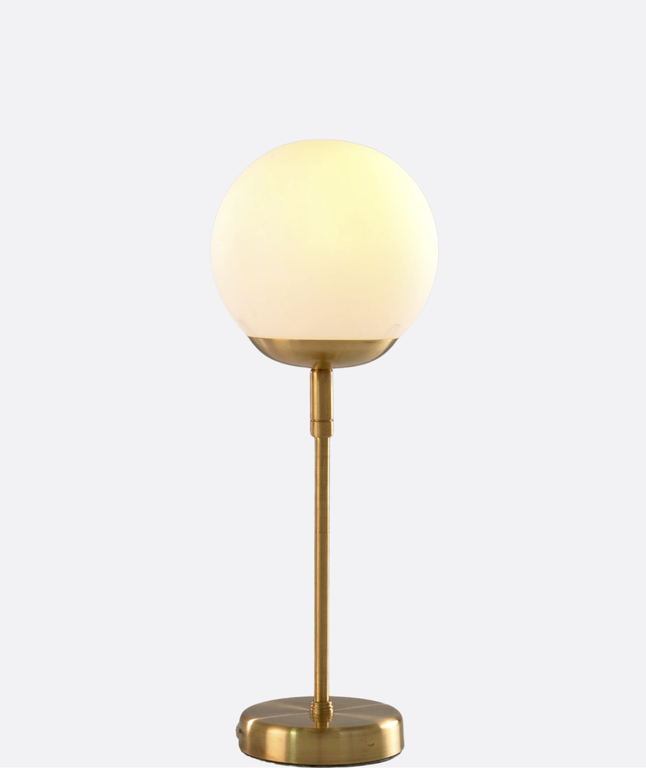 The contemporary table lamp brings a touch of sophistication, crafted from metal with a brushed gold finish that complements modern and mid-century interiors. Providing accent lighting with a warm glow, it features a fixed vertical stand and a diffused light direction powered by a single white glass globe with E27 bulb. Ideal for bedside tables, reception desks, or stylish workspaces, it combines elegance, simplicity, and durability.
