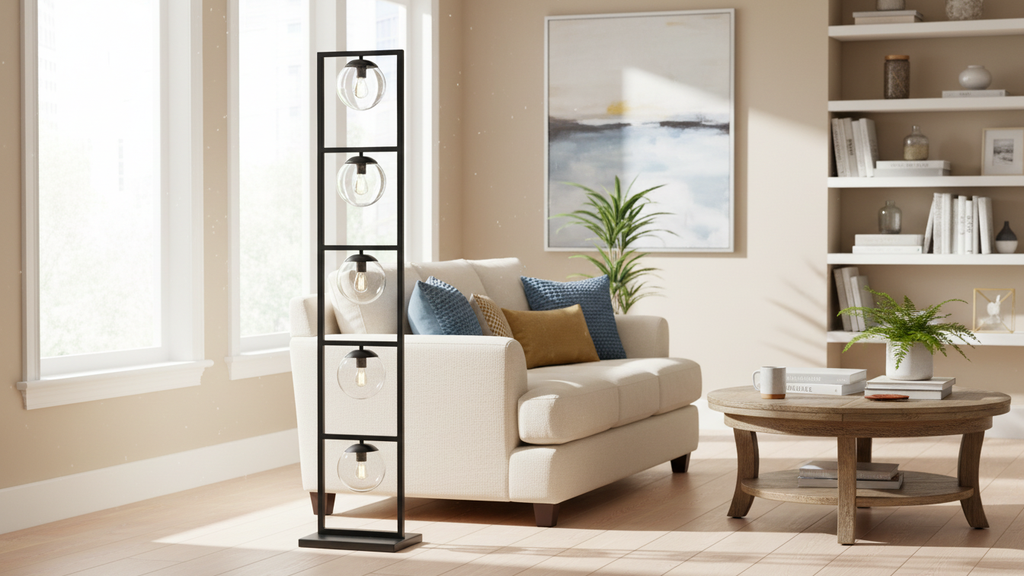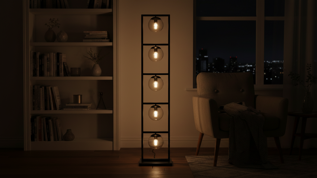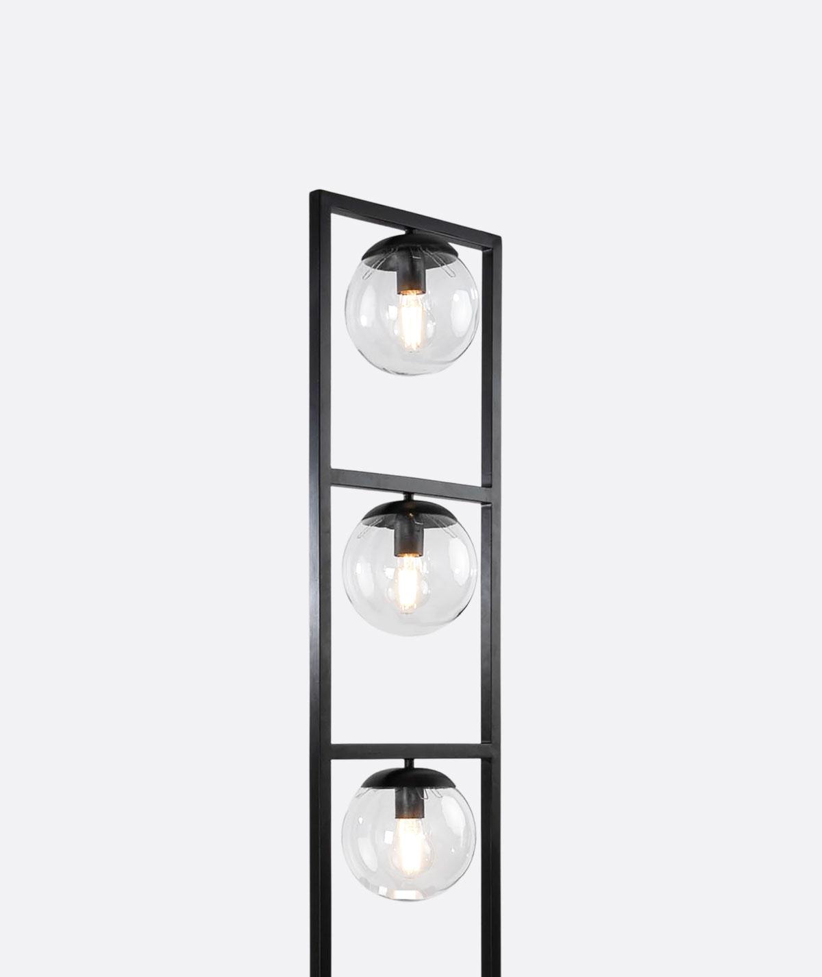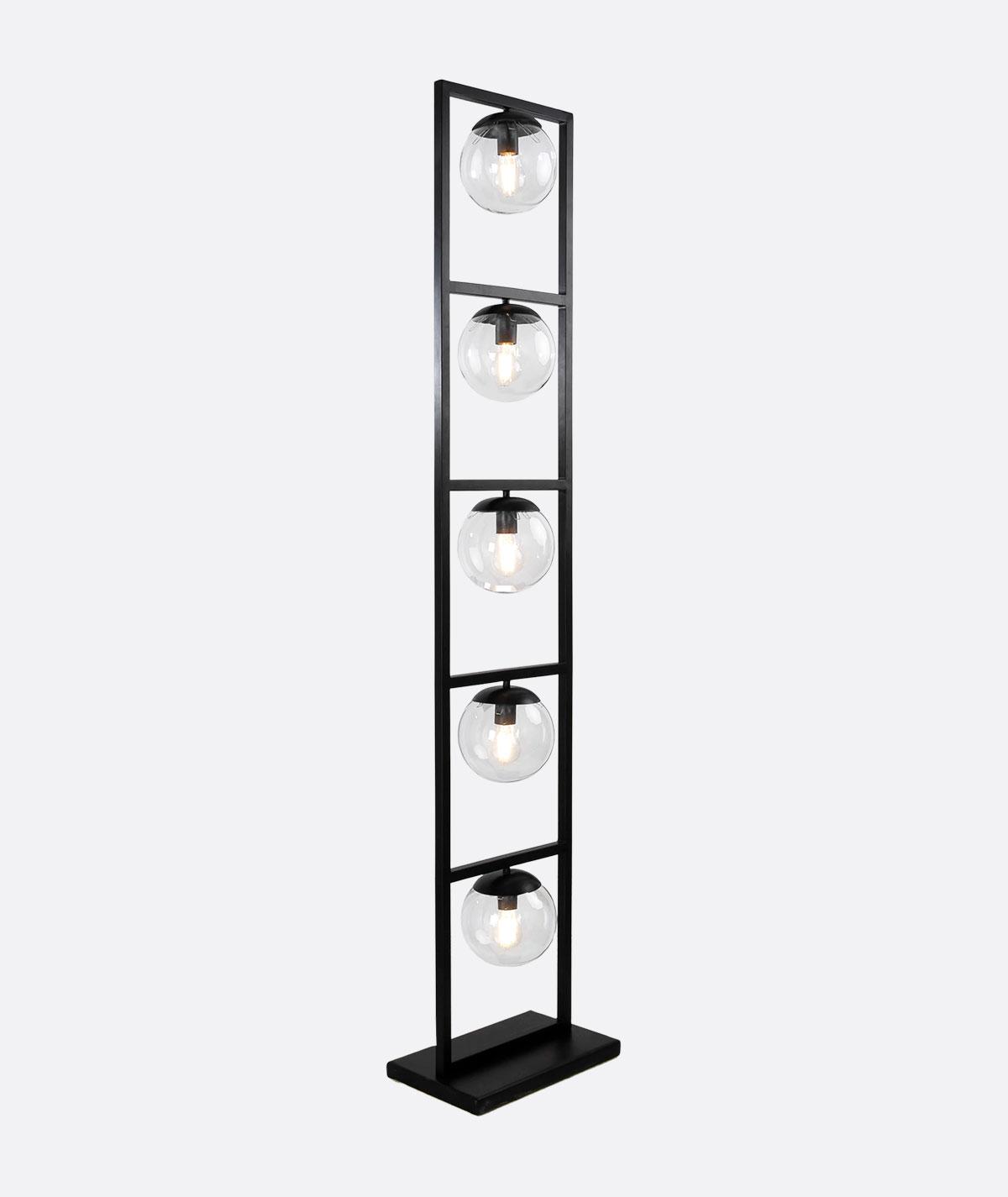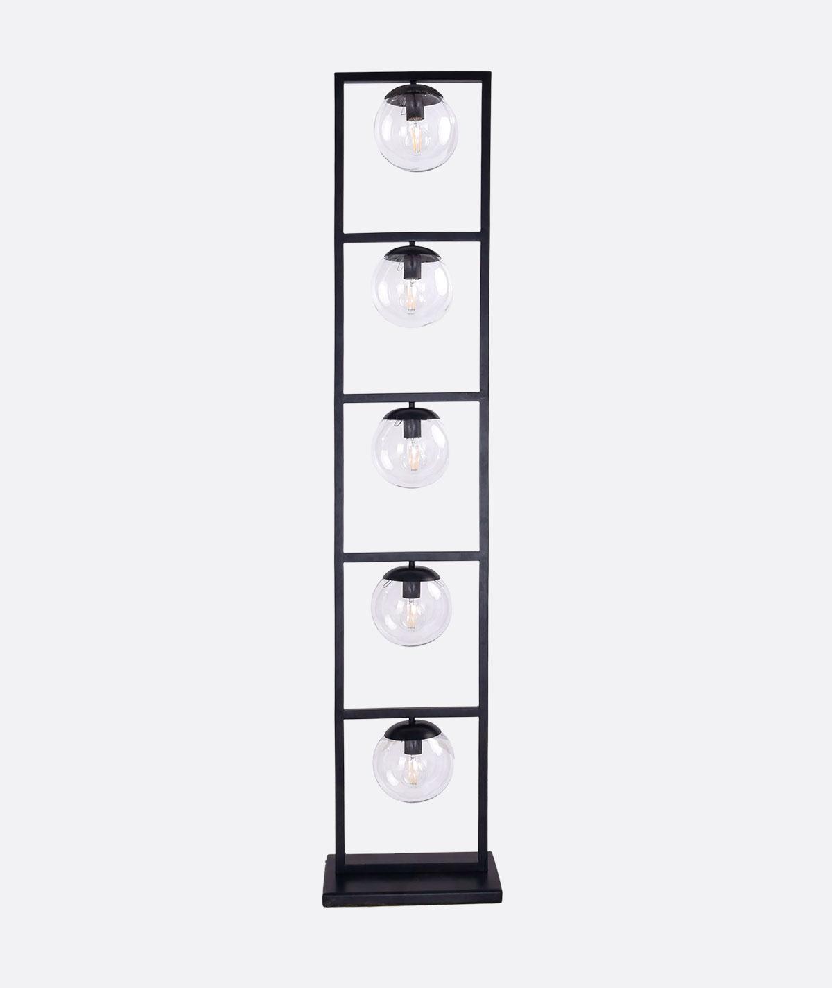 “Modern black floor lamp with a bold rectangular steel frame, divided into five horizontal sections. Each section holds a beautifully crafted glass ball with integrated lighting, creating a striking balance of geometry and elegance. This contemporary lighting unit, handcrafted in Egypt, adds sophistication and warmth to living rooms, reception areas, hospitality interiors, and stylish offices. Perfect for modern and industrial décor lovers seeking unique statement lighting.”