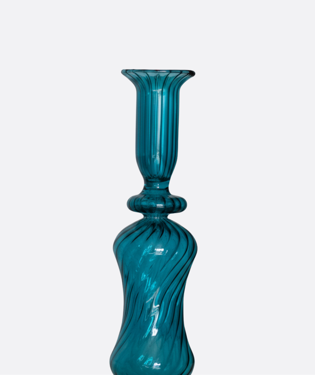 The piece is an elegant glass vase in a teal-blue hue, designed with a vertically elongated form featuring a slightly flared top and base. Its midsection is gracefully curved and decorated with a spiral pattern that adds an artistic, handcrafted touch. The glass is translucent and glossy, highlighting both the richness of the color and the intricate details of the design.