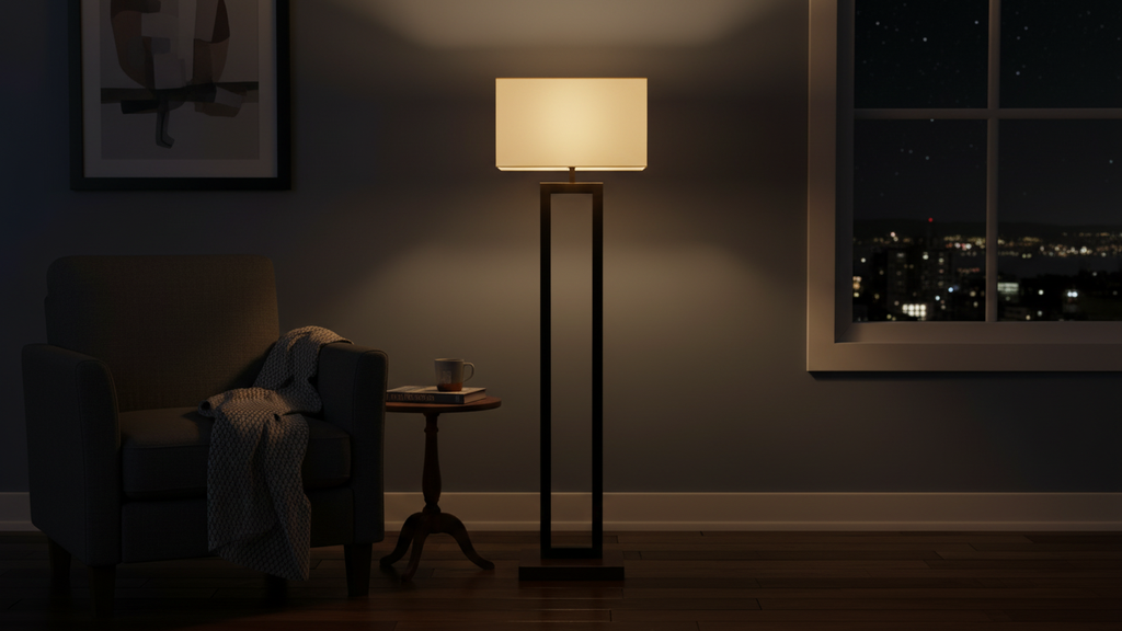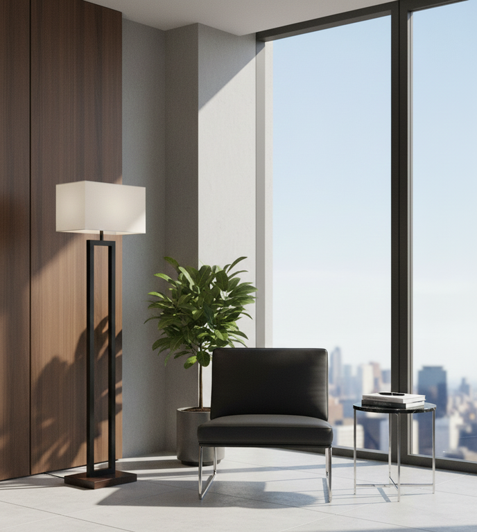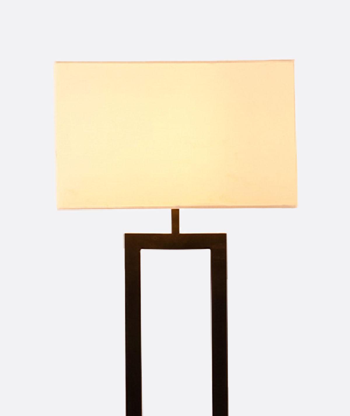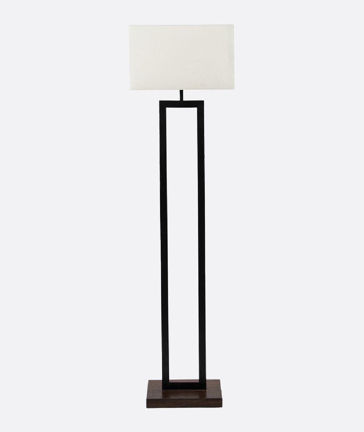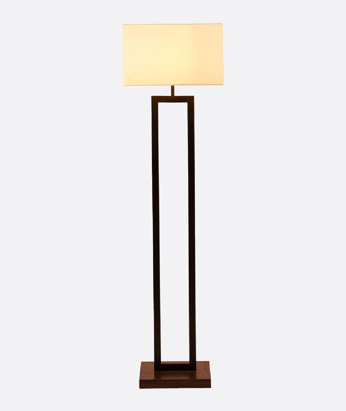 YL-F-244 A modern floor lamp with a sleek rectangular design, featuring a dark-colored open steel frame and a light-toned rectangular lampshade that emits warm, ambient light. The clean geometry and soft contrast between materials give it a calm, contemporary feel. The matte finish adds elegance without reflections.