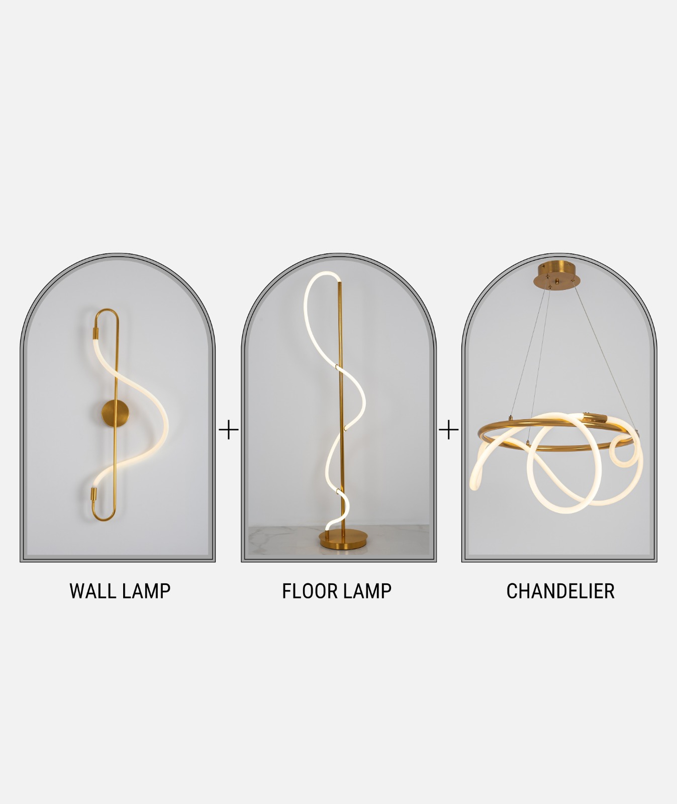 Elevate your interior with this sleek Modern Lighting Set, featuring a trio of sculptural fixtures unified by their gold-finished metal frames and luminous curved tubes:
