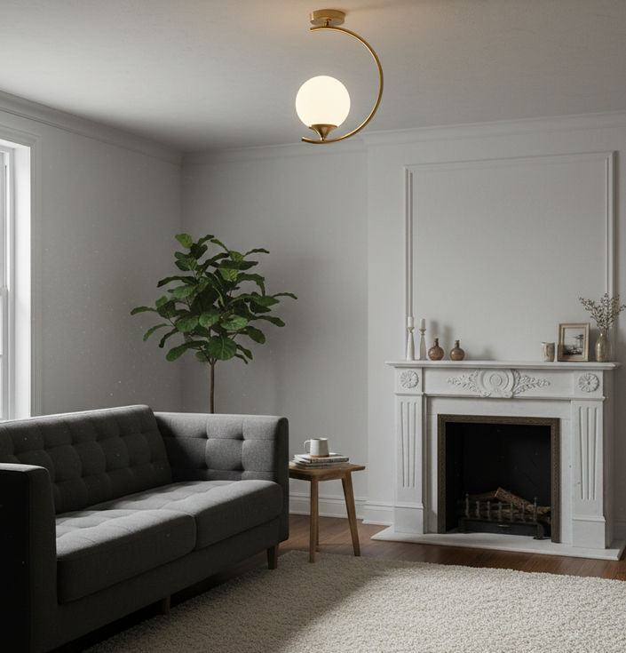 This ceiling light fixture features a contemporary artistic design that blends fluidity with elegance. It consists of a gracefully curved metallic arm in a shiny gold finish, ending with a frosted glass globe that adds a harmonious and cohesive look. The globe emits soft, diffused light, creating a warm and inviting ambiance. This design is an ideal choice for modern spaces such as living rooms, bedrooms, or reception areas, as it combines visual beauty with practical functionality.