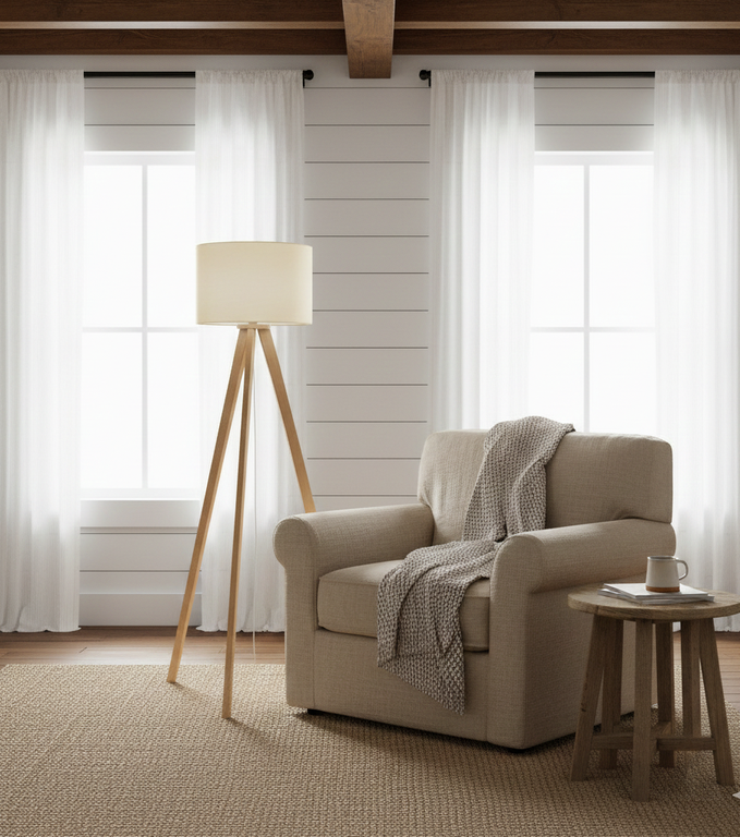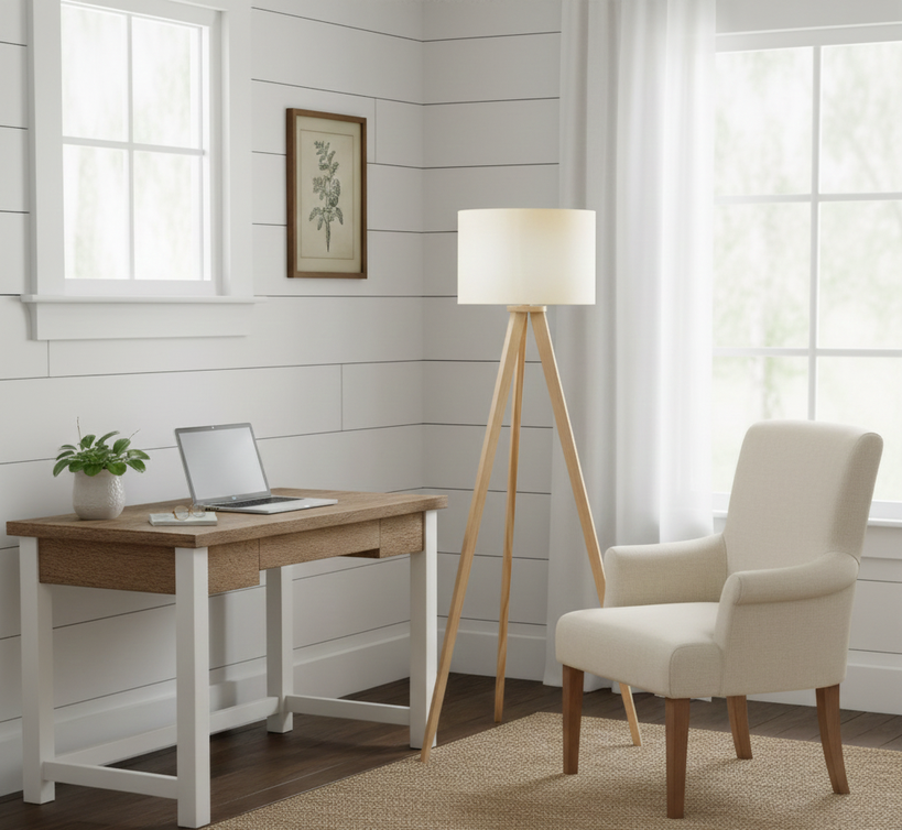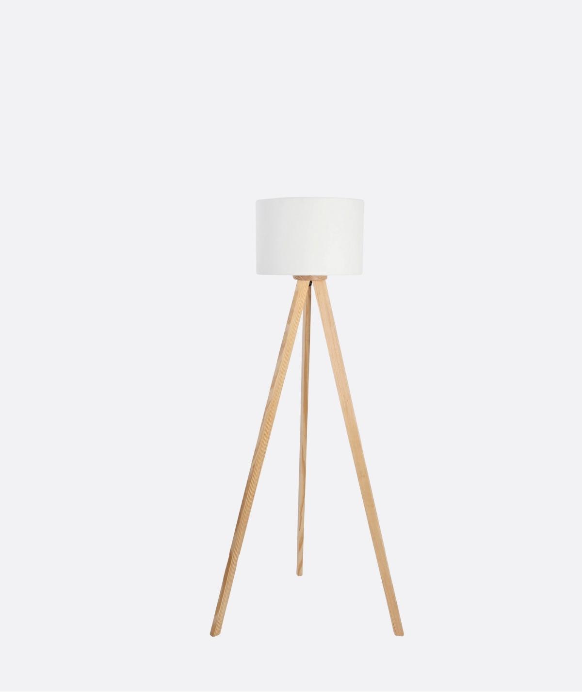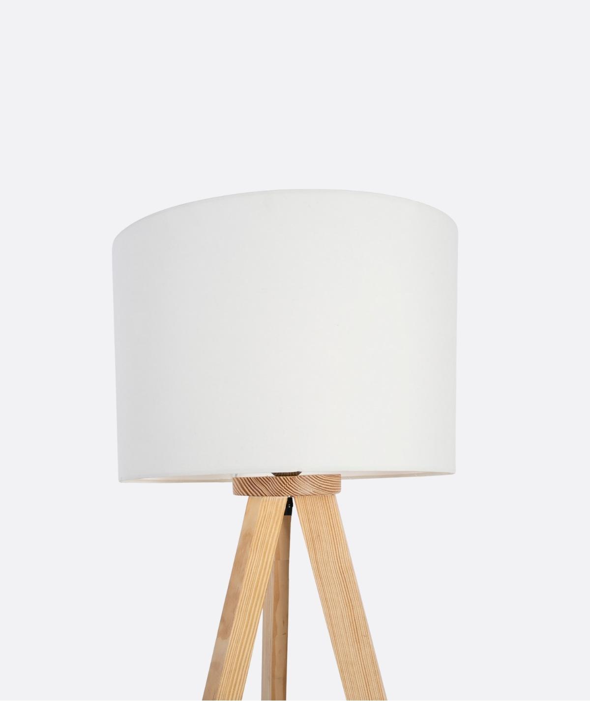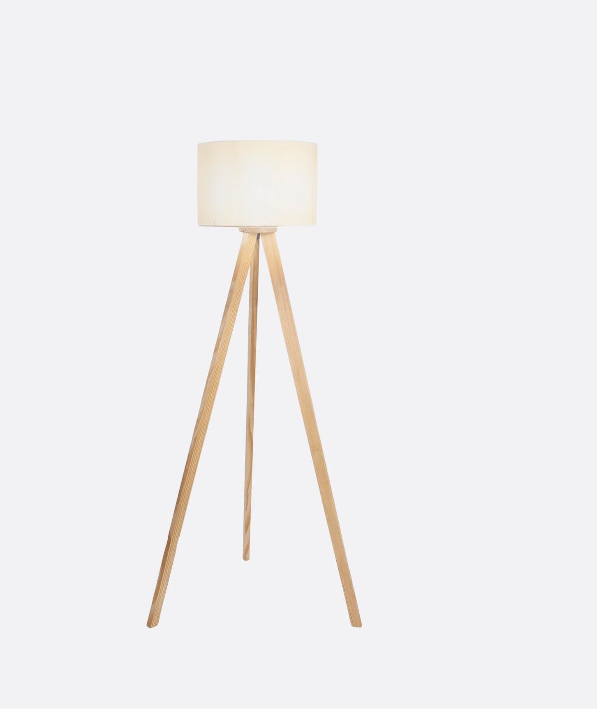 This modern floor lamp features a natural wooden tripod base paired with a crisp white cotton supported fabric shade, blending simplicity with elegance. Its clean lines and warm tones bring a Scandinavian-inspired touch while providing soft lighting ideal for living rooms, bedrooms, or reading corners. Expertly crafted in Egypt, this lamp adds both function and refined style to contemporary interiors