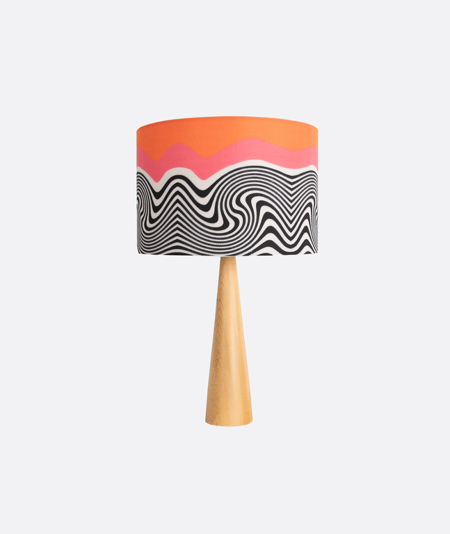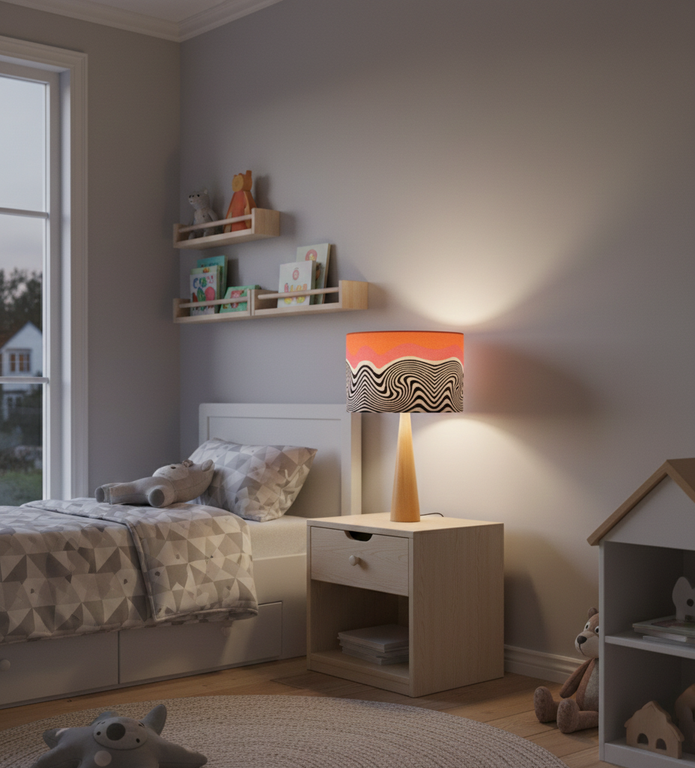 A playful charm and modern locally crafted table lamp, featuring a vibrant printed fabric shade supported by a brown-finished beech wood cone base. Designed for soft accent lighting, it’s ideal for kids’ rooms, creative workspaces, and colourful commercial interiors. The bold pattern and natural wood texture strike a perfect balance between fun and distinctive , making it a standout piece for modern décor with a youthful twist.