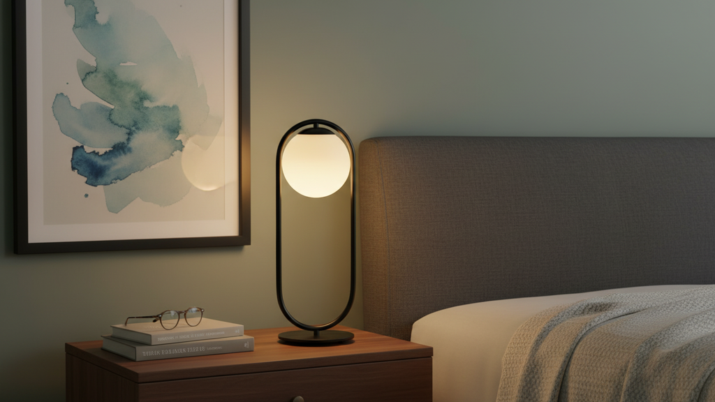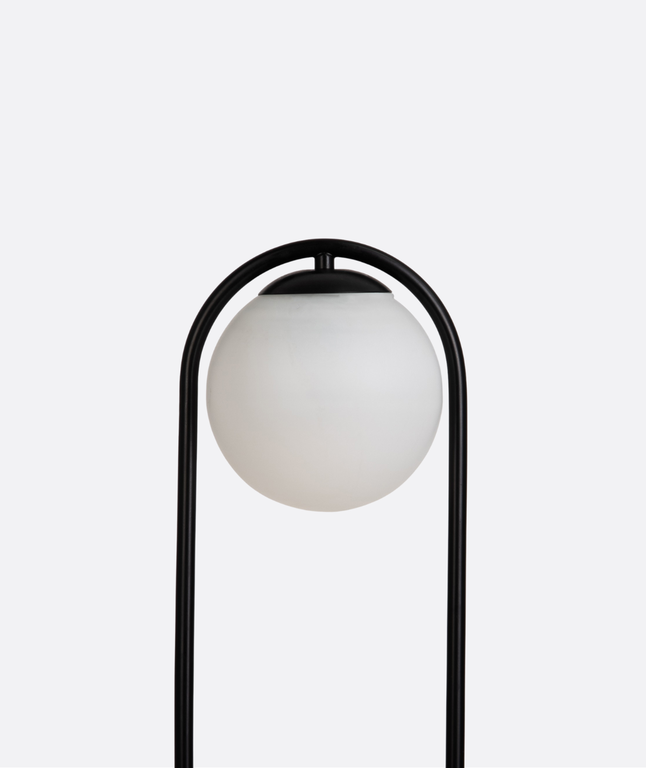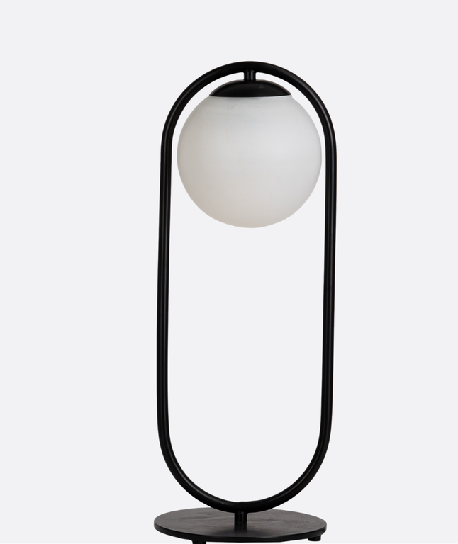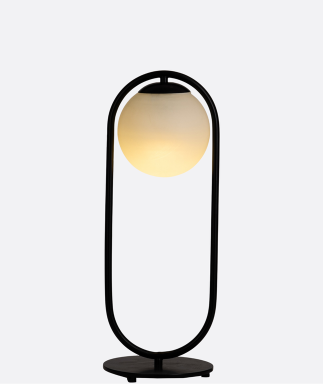 YL-T-230 A stylish table lamp with a modern, minimalist design. It features a round base and an oval-shaped black metal frame, with a frosted glass globe suspended in the center that emits a warm, diffused light. The clean lines and soft glow make it a refined accent piece.