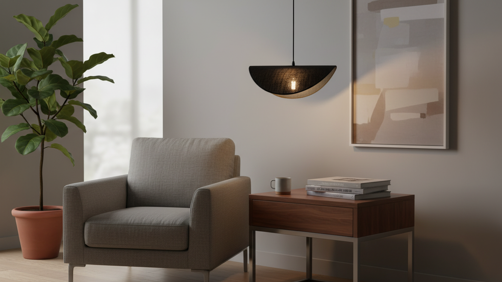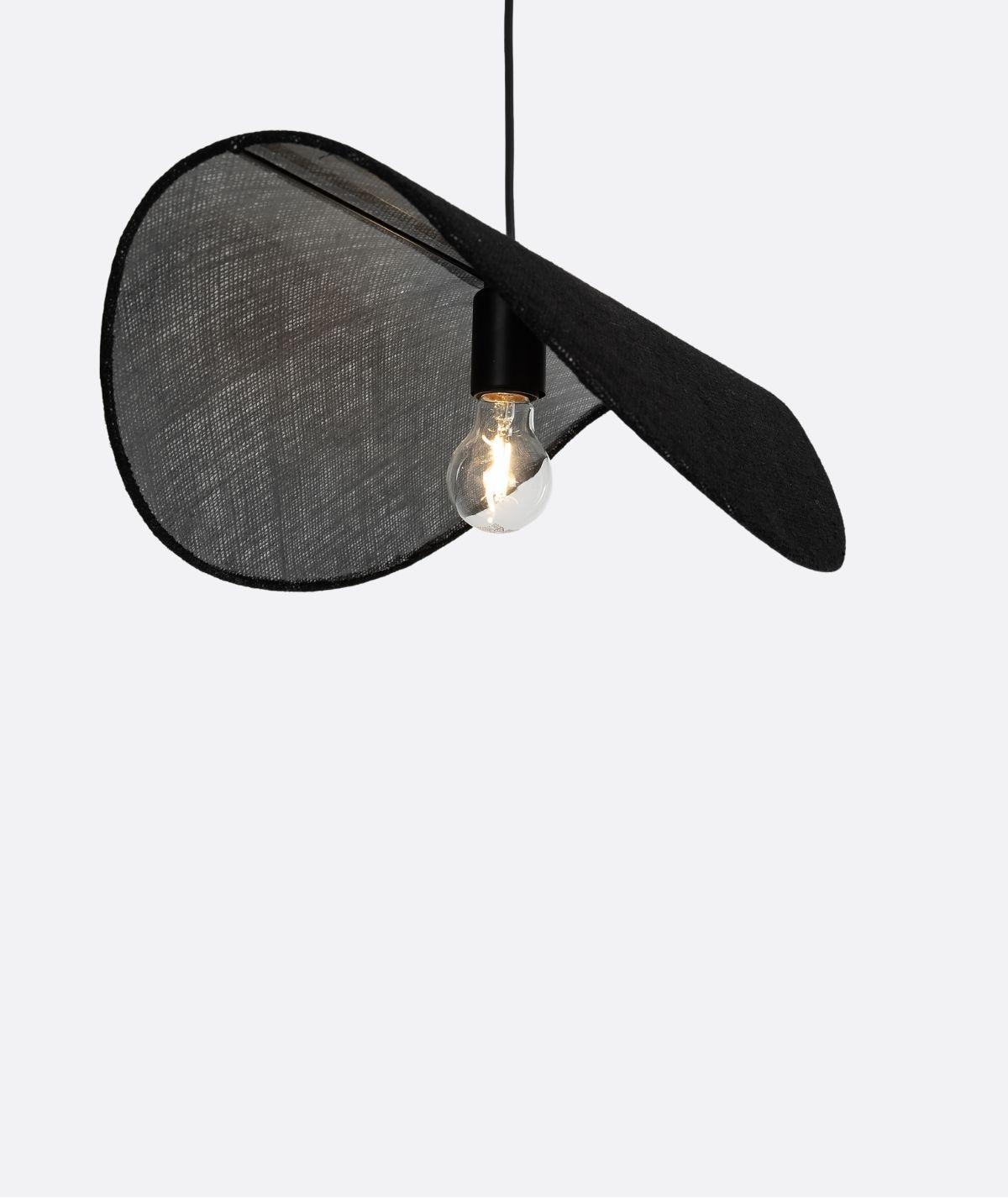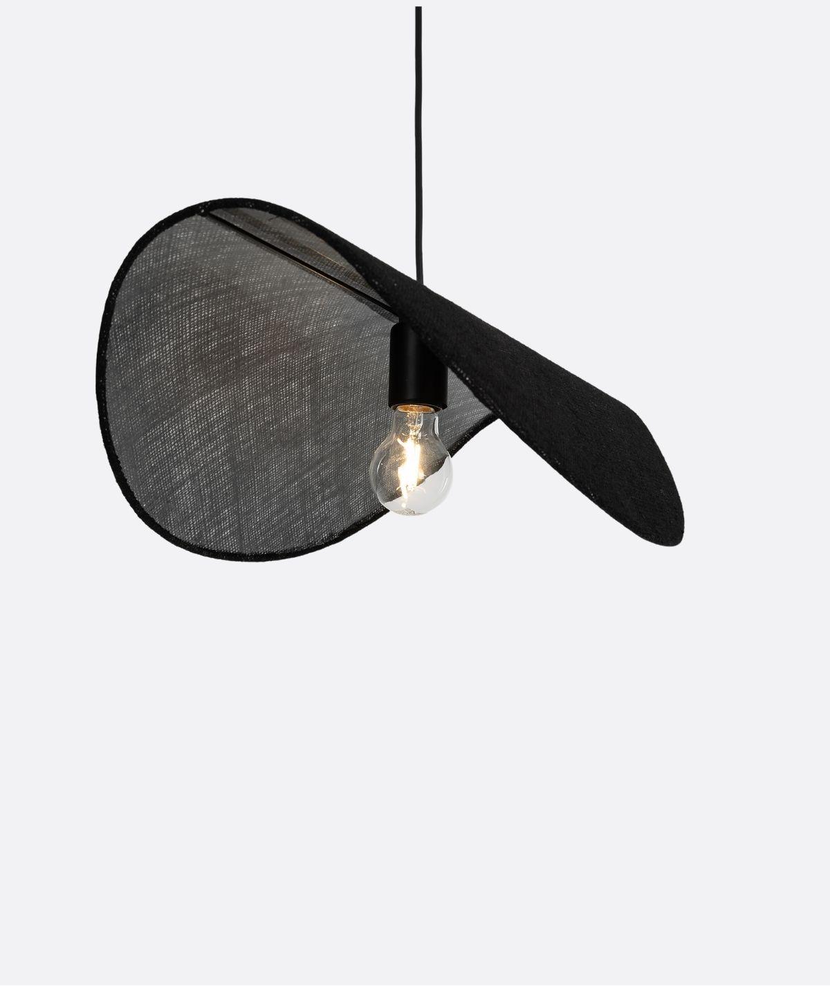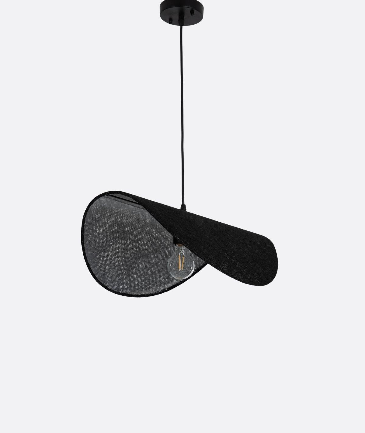 This pendant ceiling light features a black mesh shade paired with sleek black metal, combining textured fabric with modern design. Its artistic shape provides warm ambient lighting while serving as a striking decorative piece. Ideal for dining rooms, living areas, or contemporary cafés. Proudly crafted in Egypt