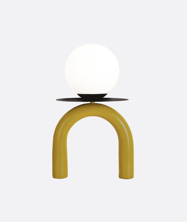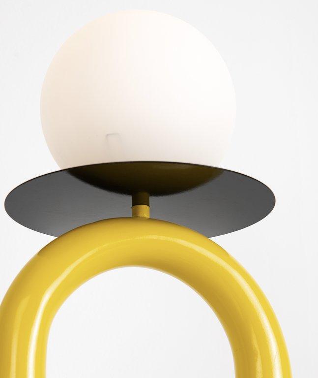 Trendy metal table lamp with a bold yellow arch frame, black detail, and white glass globe. A vibrant touch for bedrooms, living rooms, and modern décor in Egypt.