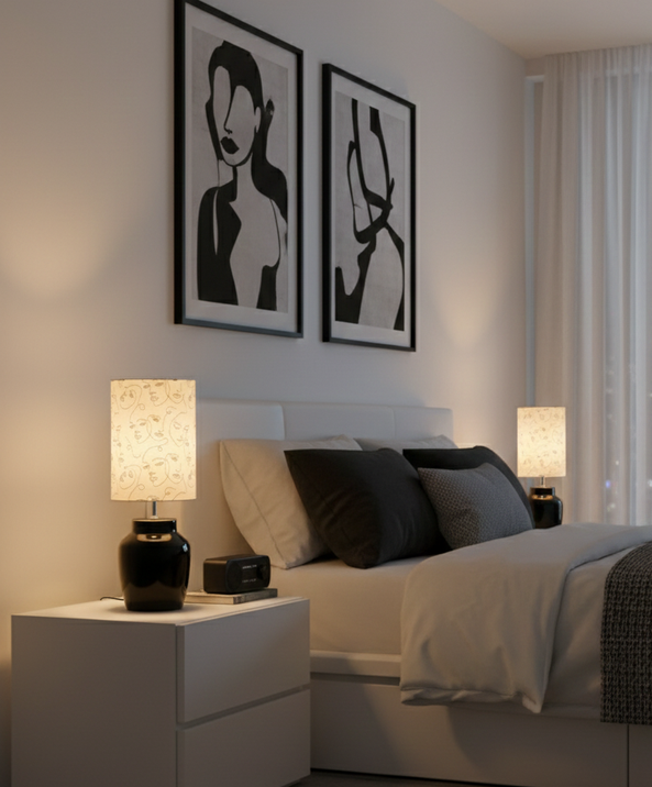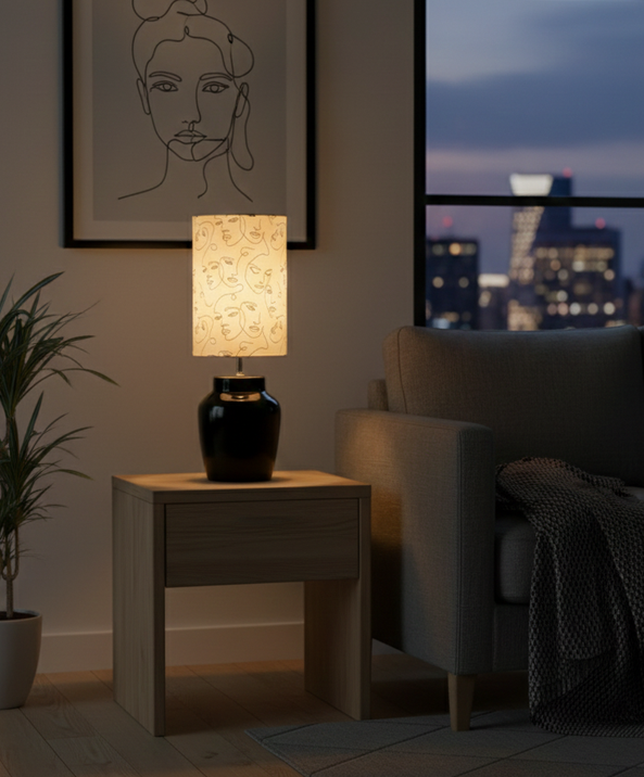 Modern pottery table lamp with a black glossy base and a cotton fabric shade featuring abstract faces line art. Designed for accent lighting, it adds warm decorative light, perfect for bedrooms, living rooms, and stylish interiors in Egypt