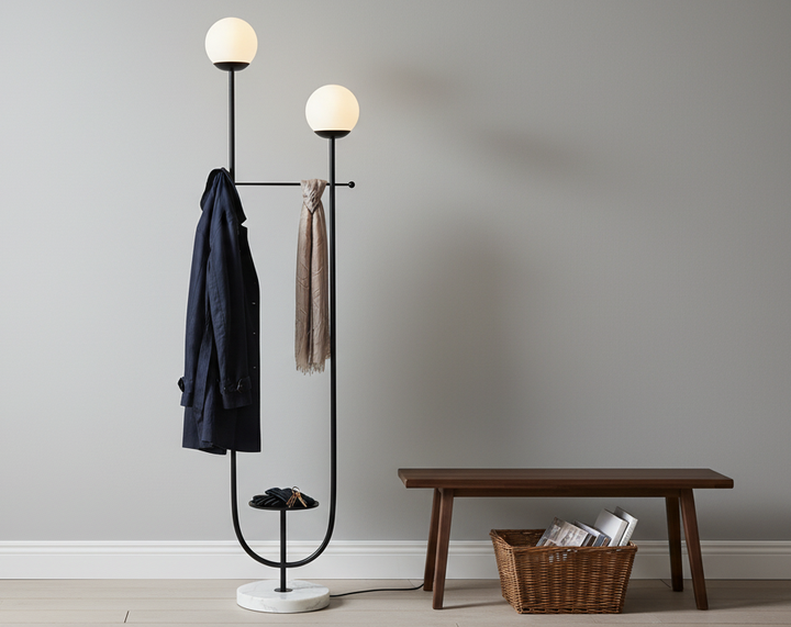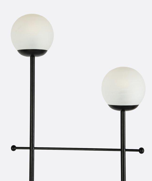 YL-F-246-BLA sculptural floor lamp with a modern, artistic flairāthis piece blends simplicity with elegance. It features two gracefully curved Black rods forming a U-shape, each topped with a soft white spherical bulb. A horizontal golden bar connects the structure, adding visual balance, while a small circular shelf at the base offers a subtle functional touch. The lamp stands on a white marble base, enhancing its luxurious and serene presence.