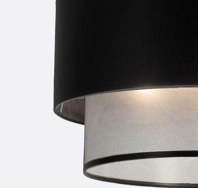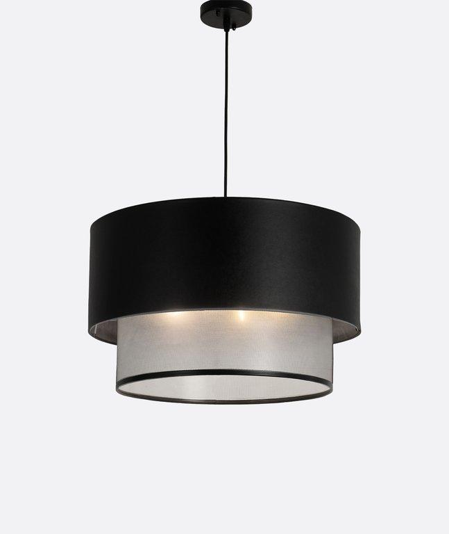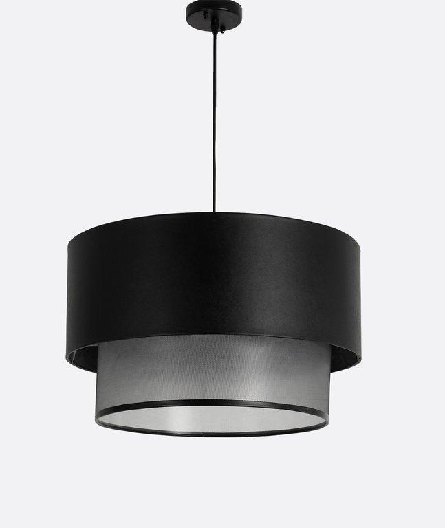 Modern pendant light featuring a layered design with a black leather outer shade and an inner black tulle fabric diffuser, creating a soft and elegant glow. Perfect for living rooms, dining areas, bedrooms, and stylish interiors in Egypt, and a great pick for those searching for modern chandeliers, fabric pendant lights, leather ceiling lamps, and contemporary home dƩcor.