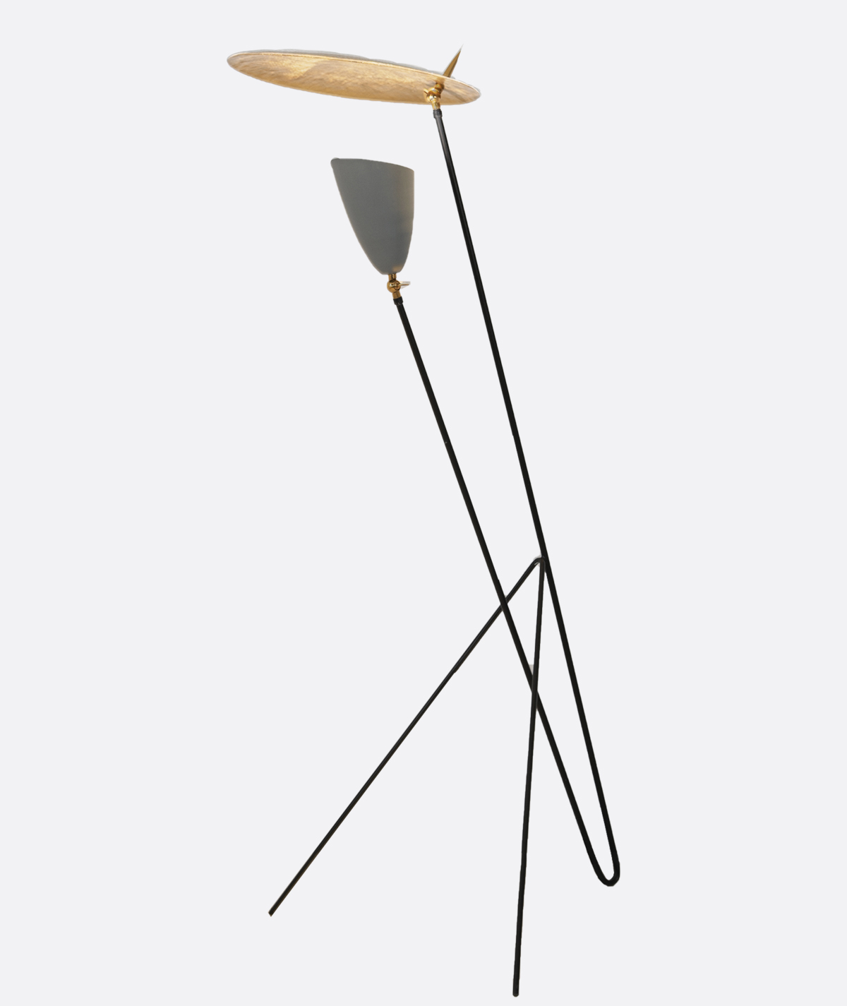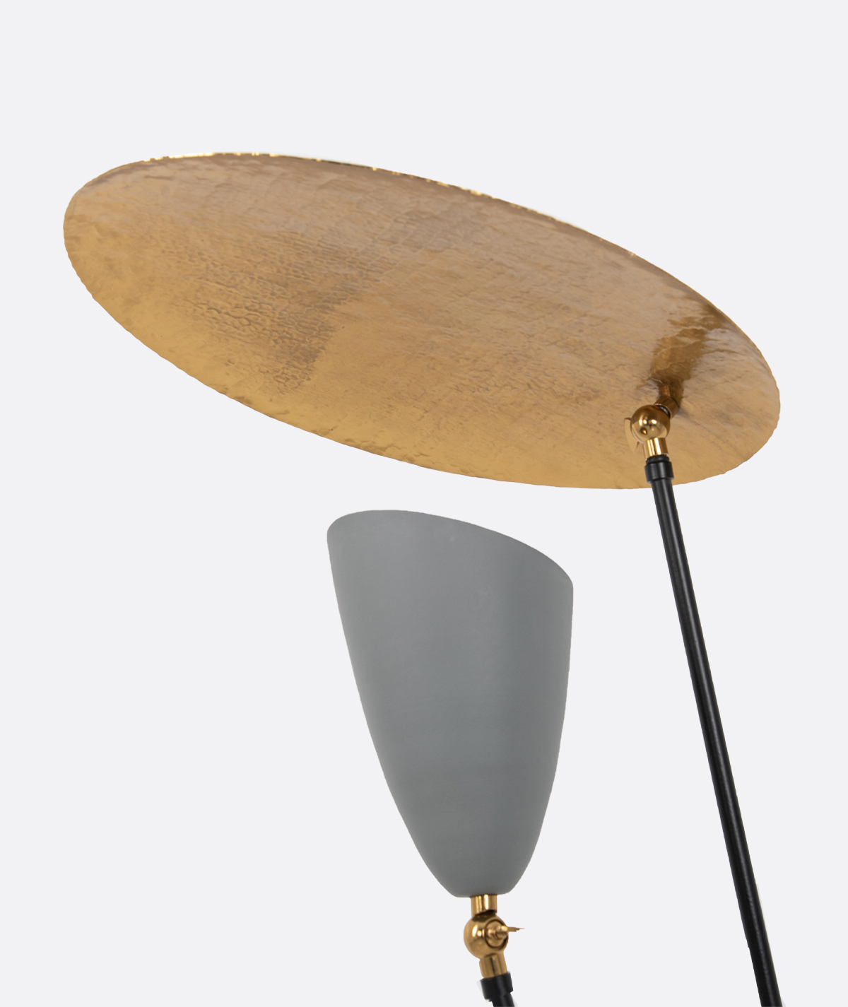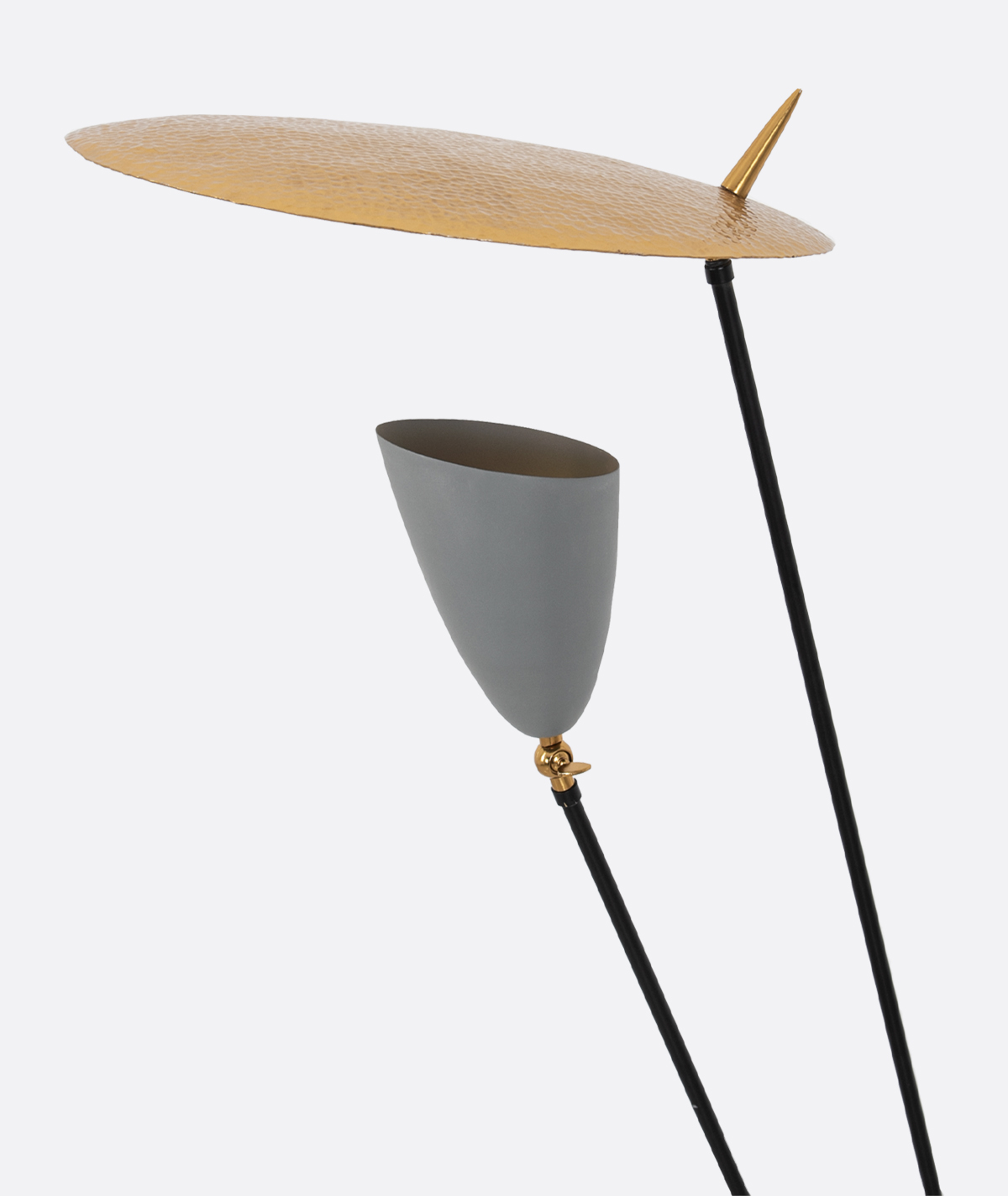 Contemporary tripod shape floor lamp with a grey cone-shaped shade and gold-plated oval reflector, mounted on black electrostatic-painted metal rods. Ideal for contemporary interiors, it adds decorative warmth and sculptural elegance to living rooms, bedrooms, or workspaces.