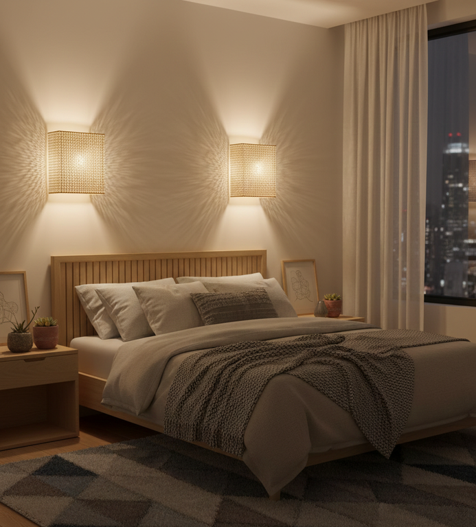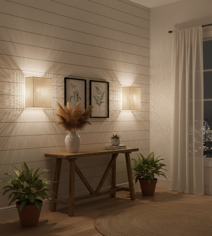 This elegant wall light is crafted from rattan wood, bringing a natural and artisanal touch to interiors. Its design softly diffuses light, creating a warm and inviting ambiance for hallways, bedrooms, or living spaces. A perfect choice for adding decorative and functional lighting with an earthy charm.