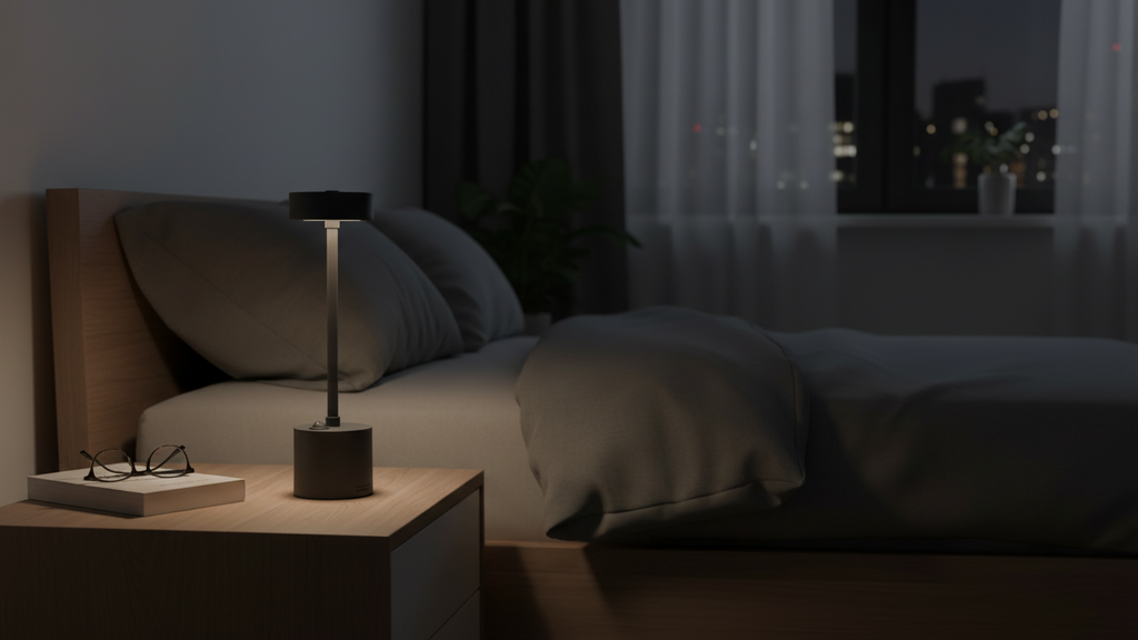 Sleek modern table lamp with a dark grey matte base and slim stem, finished with a minimal round shade. Perfect for bedroom lighting, study desks, and modern home dƩcor in Egypt.