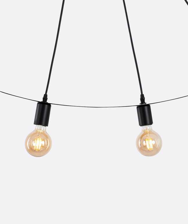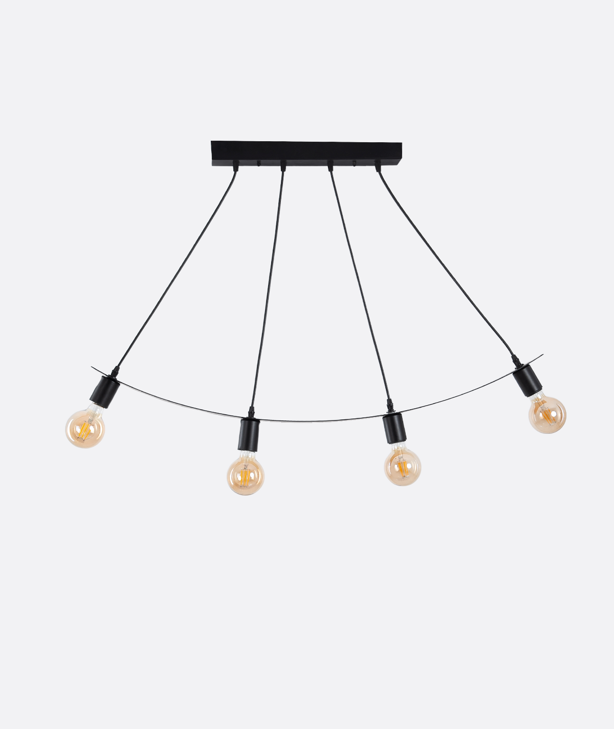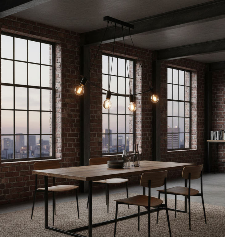 The Industrial ceiling lamp blends black metal strength with a rugged matte black finish, bringing raw industrial charm to your space. Enjoy ambient lighting warm, designed with curved suspension cords and downward light direction using 4 exposed E27-style bulbs for efficiency. Made for modern lofts and urban interiors, it combines minimalist structure or durability, practicality, and an urban edge.