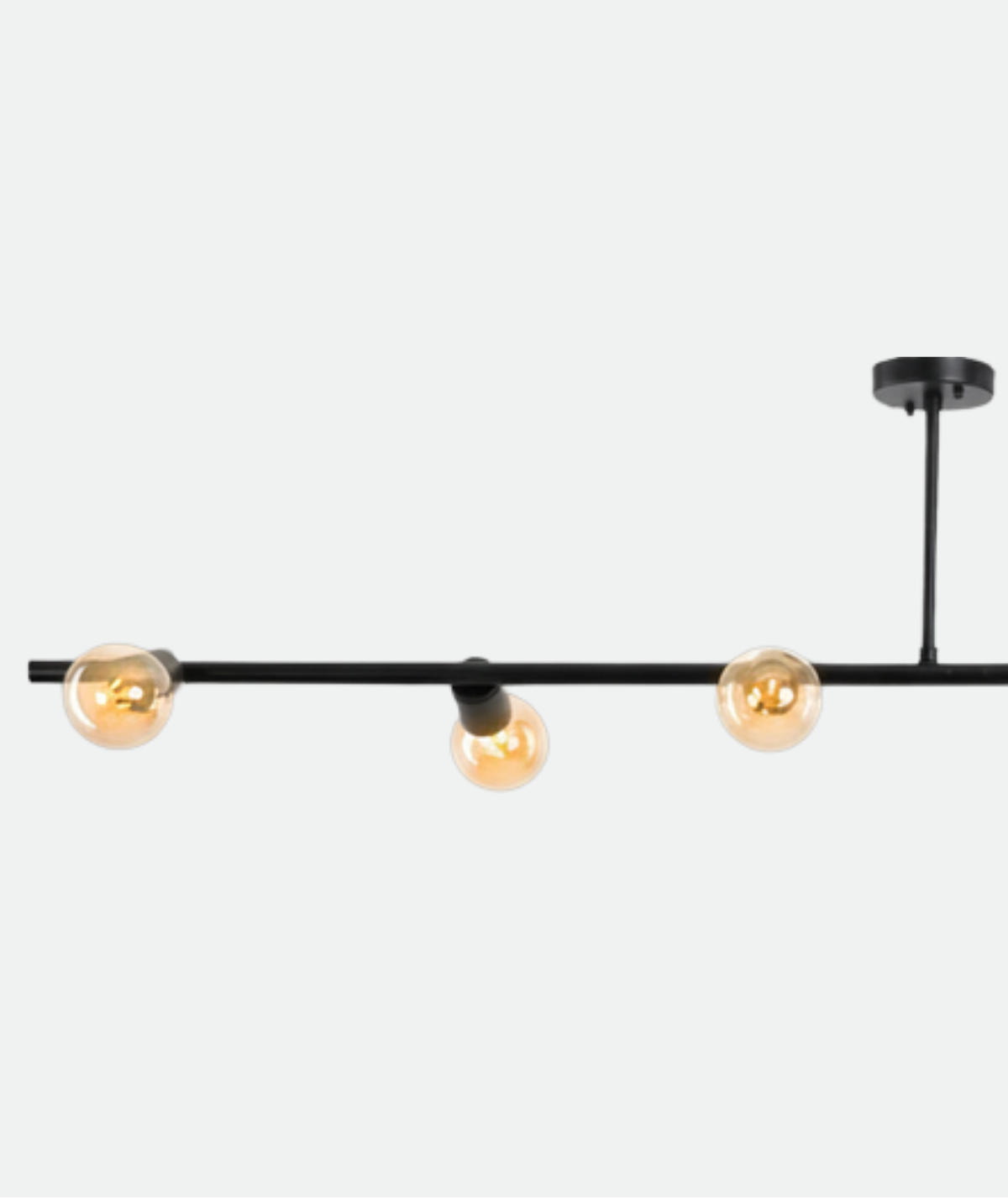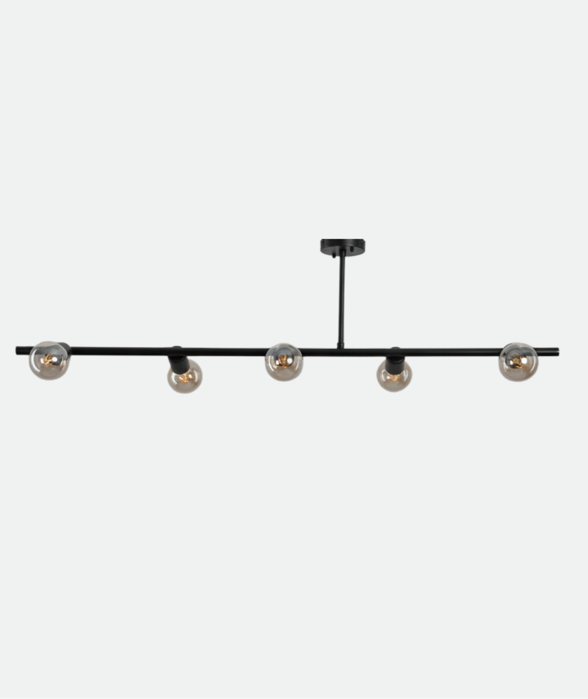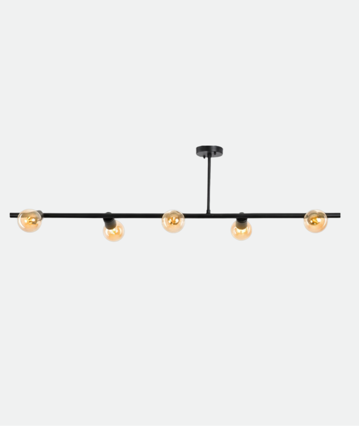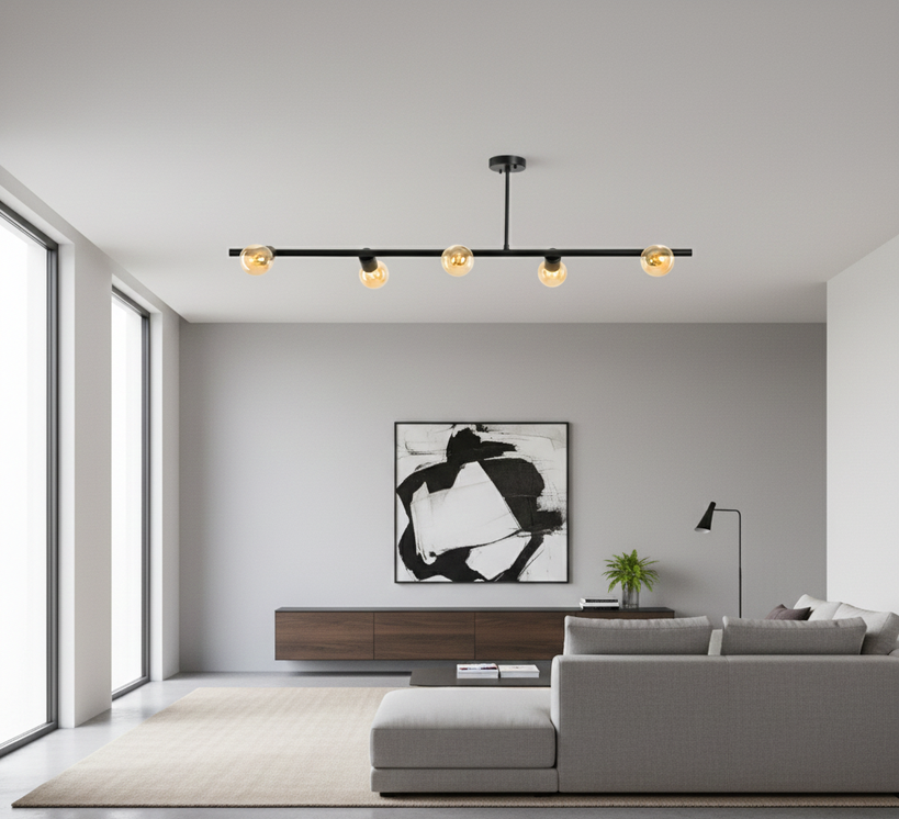 A ceiling light fixture with a modern design, featuring five exposed bulbs arranged in a straight line on a sleek black metal frame. It offers warm, direct lighting and adds an elegant industrial touch to any interior space. Perfect for living rooms, dining areas, or contemporary-style offices, it highlights design details in a simple yet striking way.