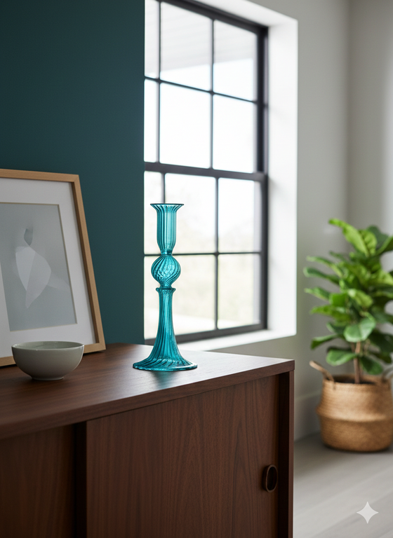 The piece is an elegant glass vase in a teal-blue hue, designed with a vertically elongated form featuring a slightly flared top and base. Its midsection is gracefully curved and decorated with a spiral pattern that adds an artistic, handcrafted touch. The glass is translucent and glossy, highlighting both the richness of the color and the intricate details of the design.