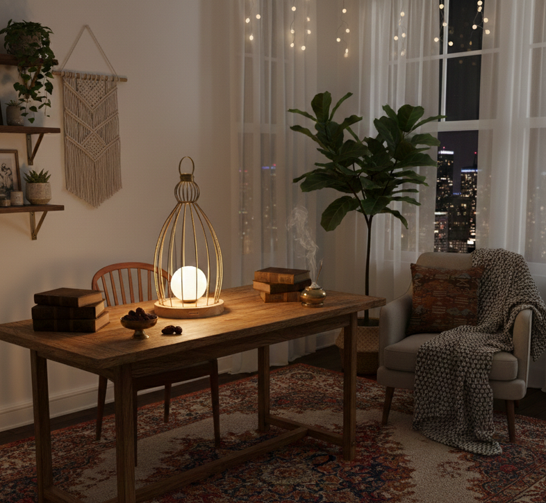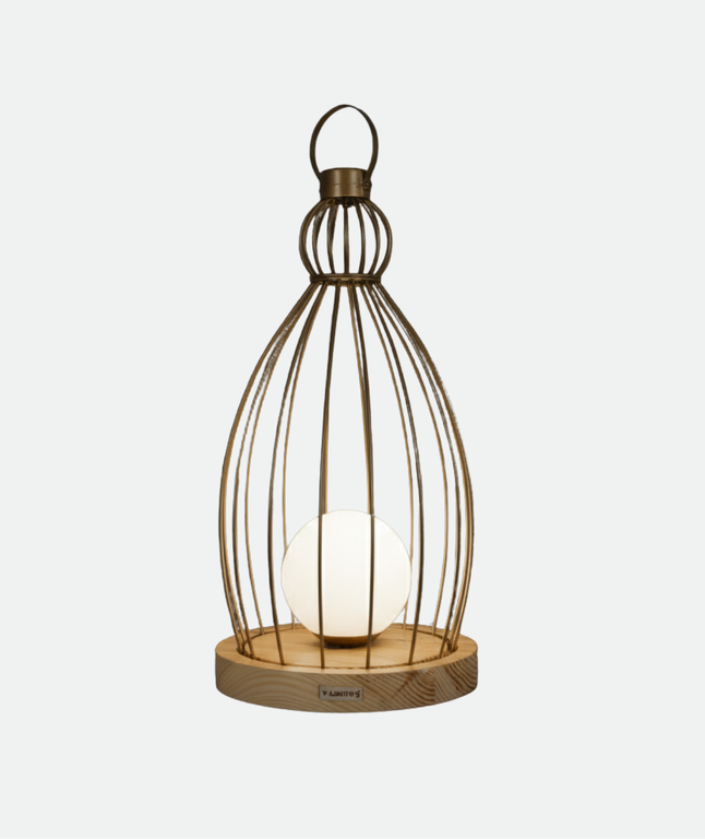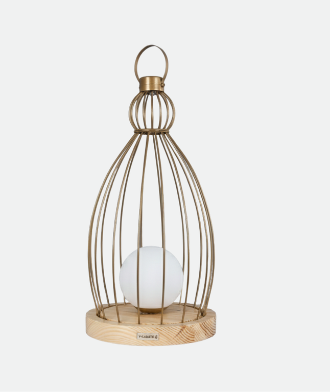 Islamic-style table lamp with a gold metal Lantern and a natural wooden base, featuring a white glass globe that adds warmth and elegance. A perfect blend of tradition and modern design, ideal for living rooms, bedrooms, and decorative interiors in Egypt.