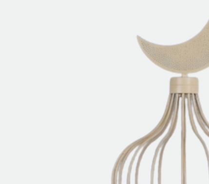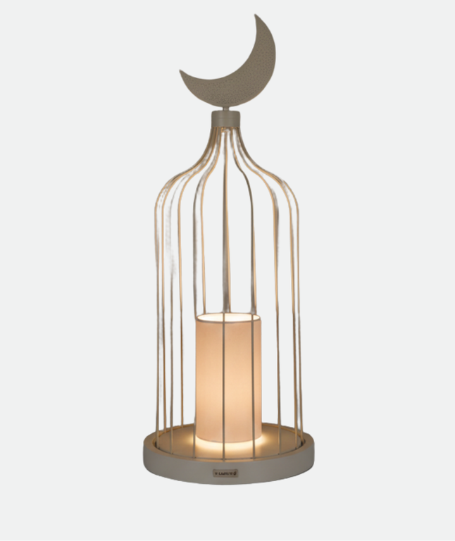 Modern Islamic beige metal table lamp with white wooden base and moon detail. A chic accent light for stylish homes in Egypt.