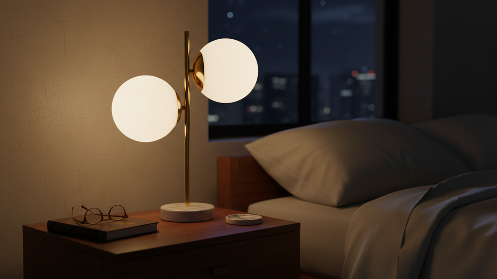 YL-T-197-A stylish table lamp with a modern design that combines marble, golden metal, and frosted glass. It features two glowing spheres that create a warm and cozy light, making it both decorative and functional. Its balanced shape and elegant finish make it perfect for spaces that value refined details.