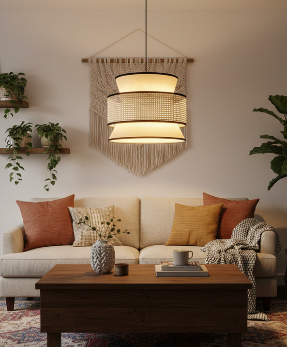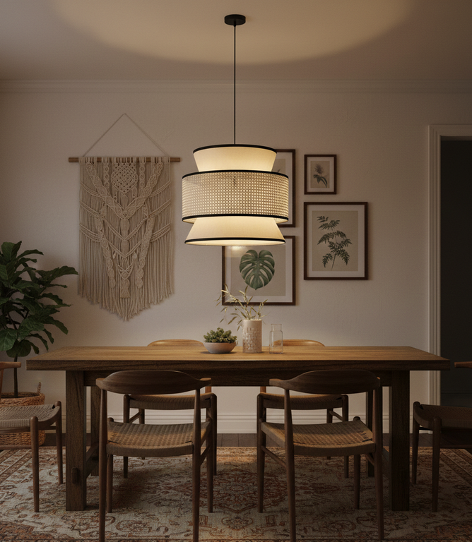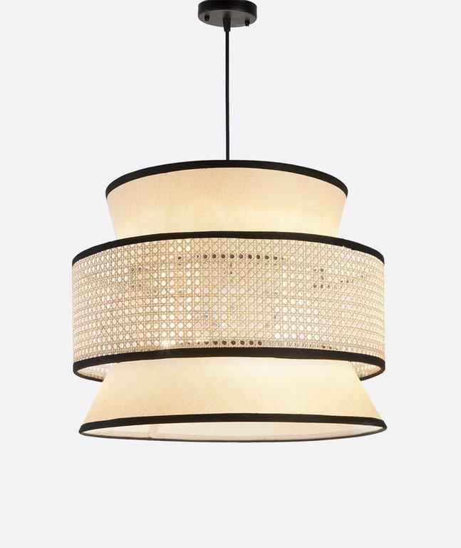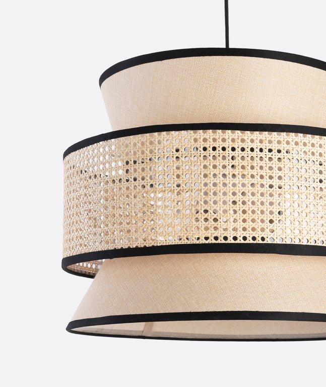 Bring a modern touch to your home with this Ā Modern Pendant Ceiling , made from rattan and linen and finished in black and light beige for a refined look.
