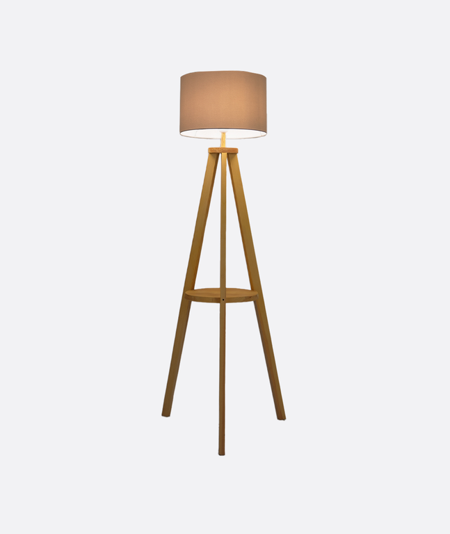 Stylish tripod floor lamp with a natural wood base and white cotton shade. A minimalist design that creates warm ambient lighting, perfect for living rooms and bedrooms.