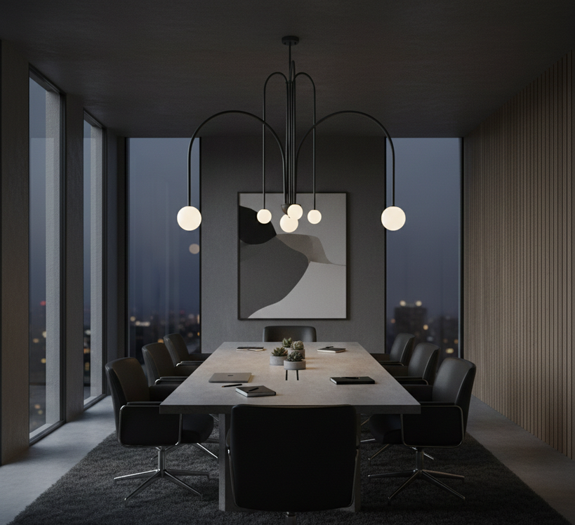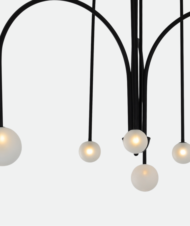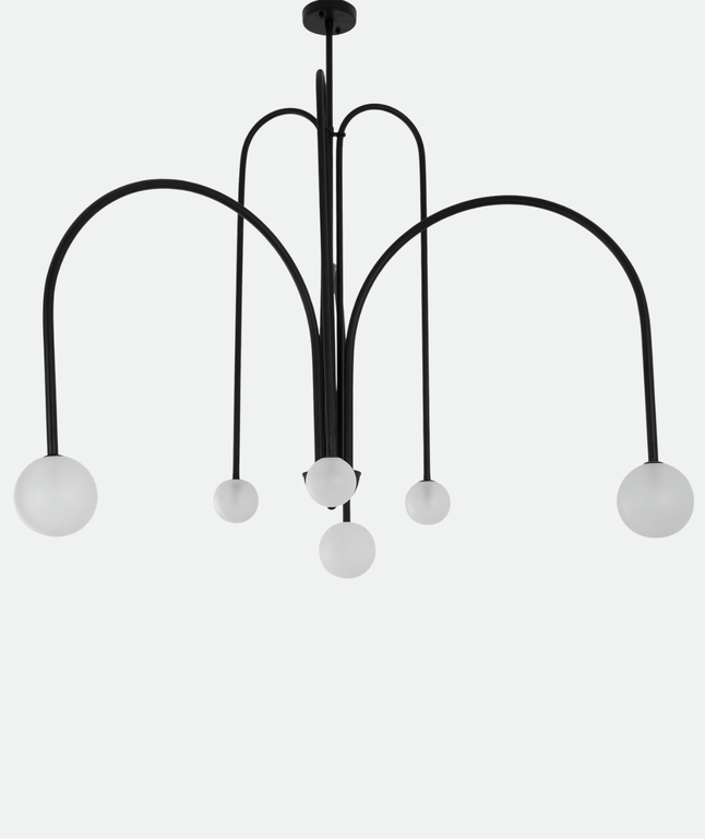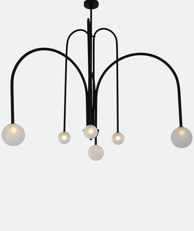 A modern minimalist chandelier featuring a central black metal stem with six gracefully curved arms extending downward, each ending in a warm glowing spherical bulb. The symmetrical composition blends simplicity with elegance, making it ideal for dining rooms, industrial-style living areas, or spacious entryways that benefit from a sculptural lighting element.