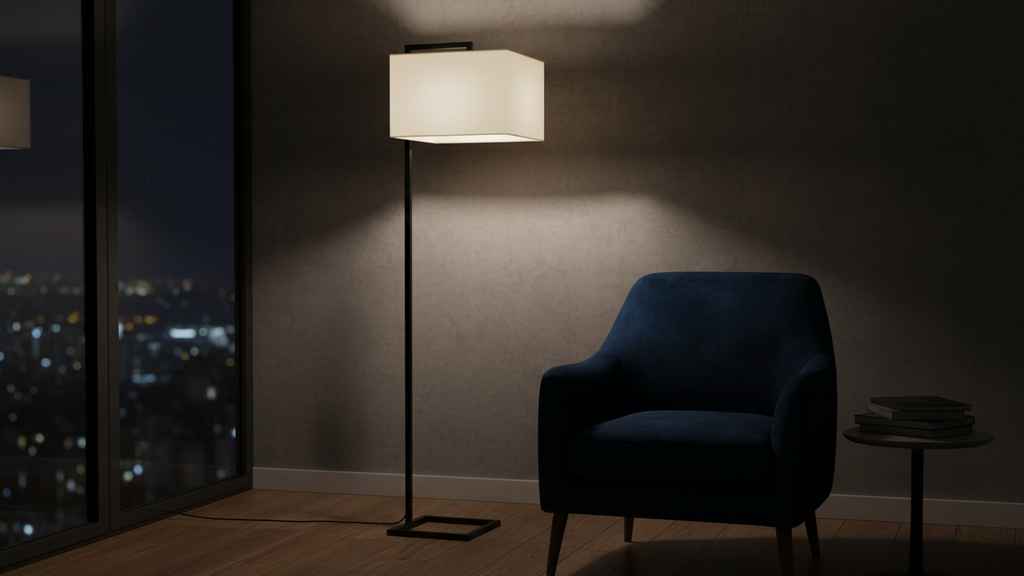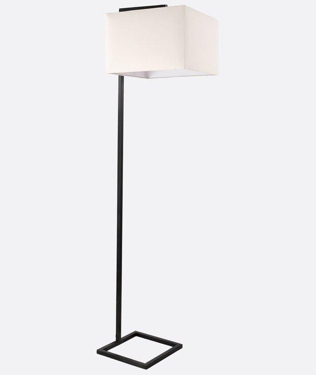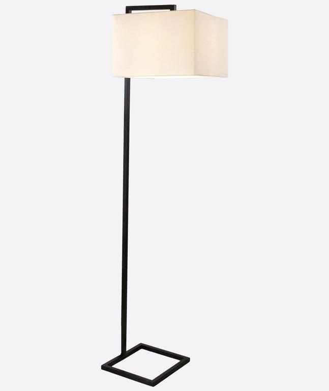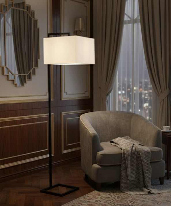 This modern floor lamp features a sleek rectangular shade and a geometric open base in matte black. Its minimalist design adds elegance and soft lighting to any space. Perfect for living rooms, bedrooms, offices, and hospitality interiors in Egypt.