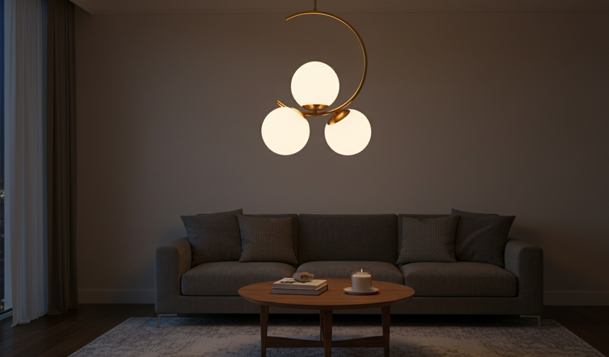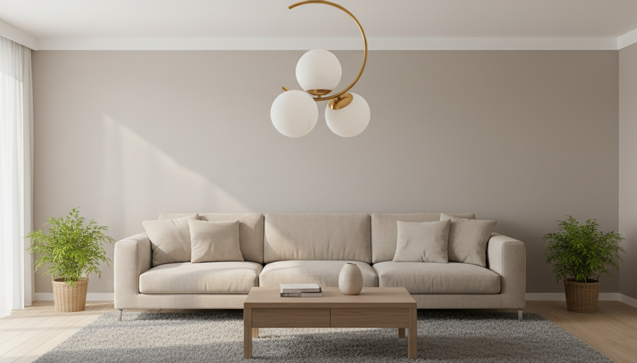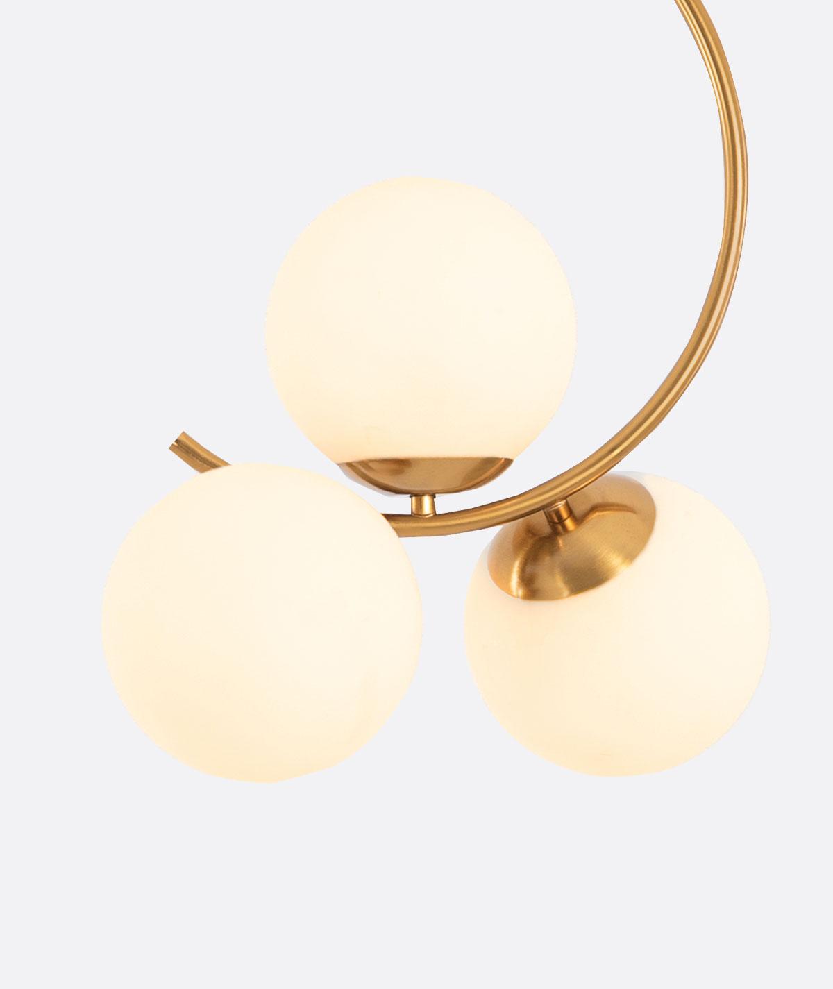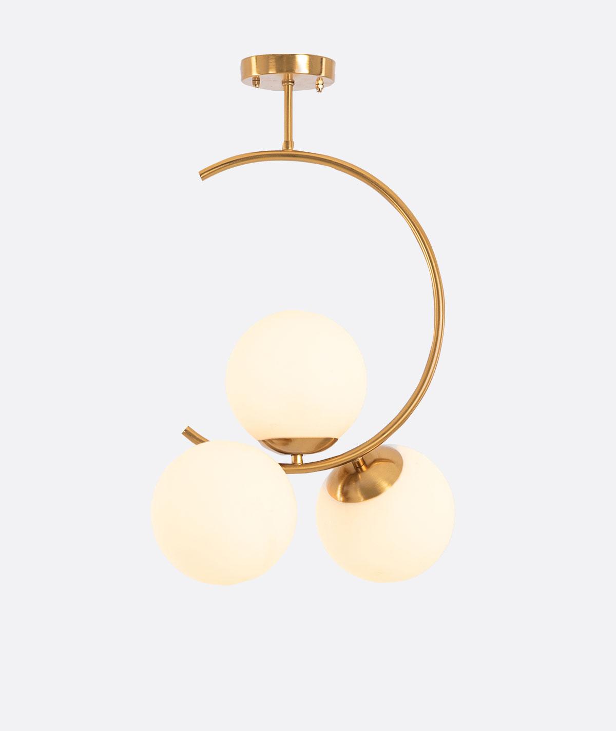This ceiling light fixture features a contemporary artistic design that blends fluidity with elegance. It consists of a gracefully curved metallic arm in a glossy gold finish, ending with three frosted glass globes arranged in a refined triangular formation. This composition gives the fixture a harmonious and cohesive appearance. The frosted globes emit soft, diffused light, creating a warm and inviting ambiance. This design is an ideal choice for modern spaces such as living rooms, bedrooms, or reception areas, as it combines visual beauty with practical functionality.