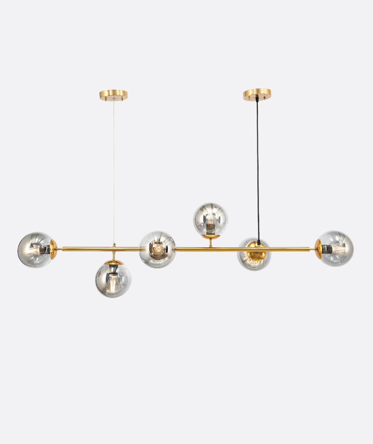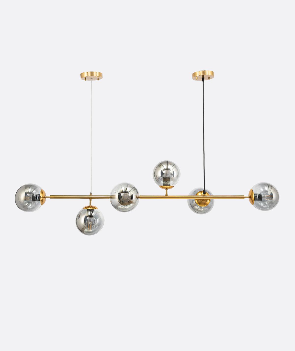 YL-C-245 A modern ceiling chandelier with a sleek and symmetrical design, featuring a horizontal polished gold rod supporting six evenly spaced clear glass globes. Each globe houses an exposed filament bulb, offering warm ambient light with an industrial touch. The fixture is suspended by dual cordsāone white and one blackāconnected to a round gold ceiling mount.