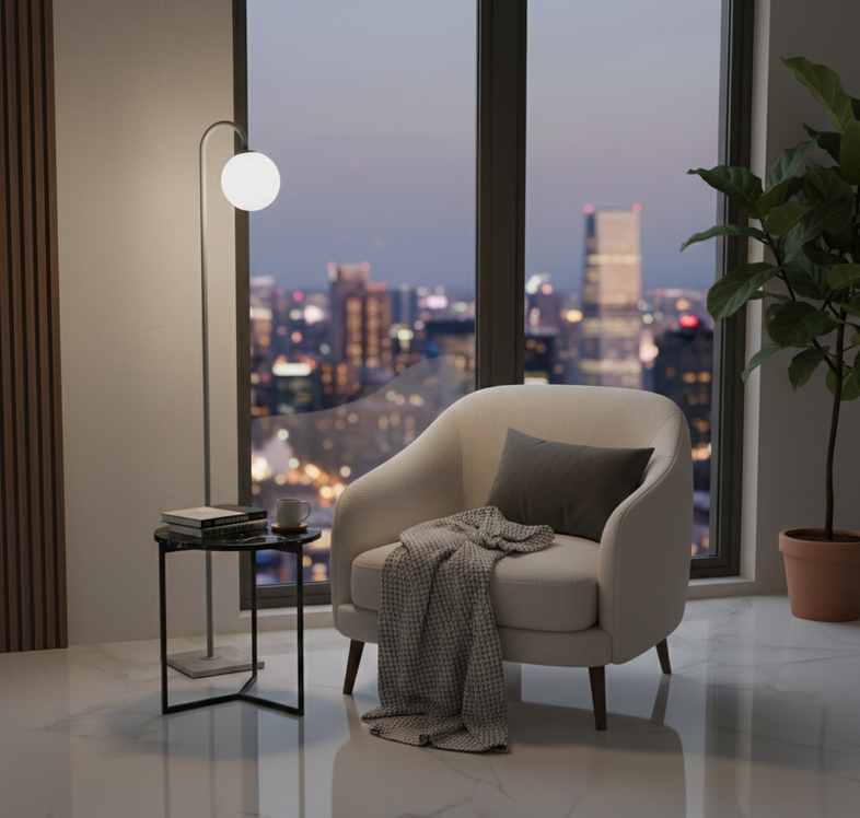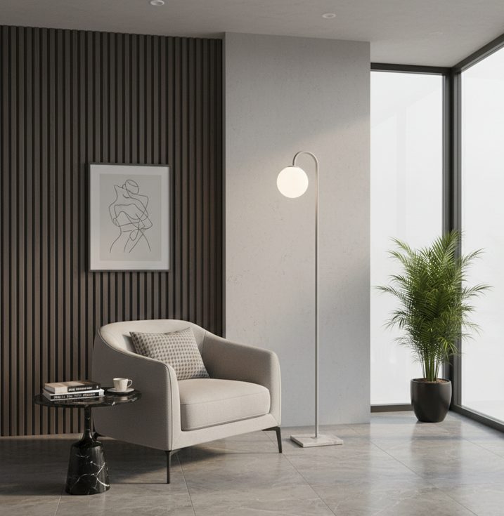 Elevate your space with this sleek and sophisticated floor lamp, designed to blend seamlessly into contemporary interiors. Featuring a slim metal pole that curves gracefully to cradle a spherical bulb, this piece combines elegance with functionality. perfect fit for modern living rooms, offices, or quiet corners. More than just a light source, this lamp is a statement piece that adds warmth and refinement to any room.