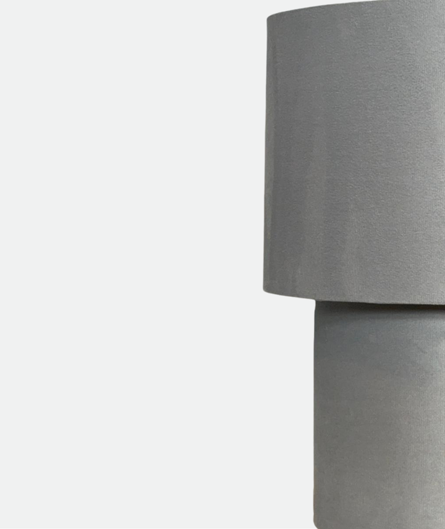 A geometrically modern abajour composed of two vertically stacked cylinders—the top one wider and shorter, the bottom one taller and slimmer—both with a smooth matte gray surface suggesting metal or concrete. The composition is visually balanced and reflects a minimalist industrial style, making it suitable for contemporary spaces such as galleries, industrial-themed offices, or artistic corners in modern homes.