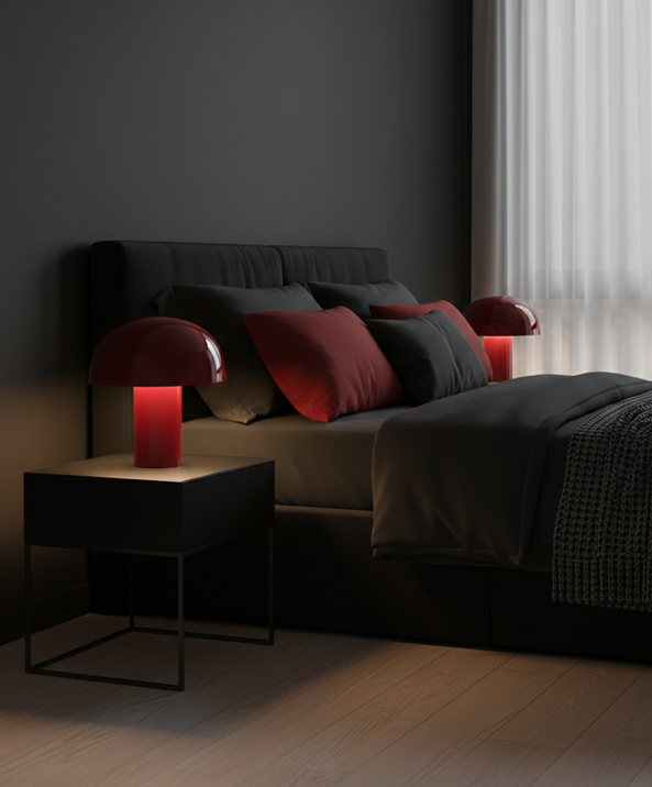 Modern red mushroom table lamp with a glossy metal finish, offering soft ambient lighting. A bold decorative piece, perfect for bedrooms, living rooms, and stylish interiors in Egypt.