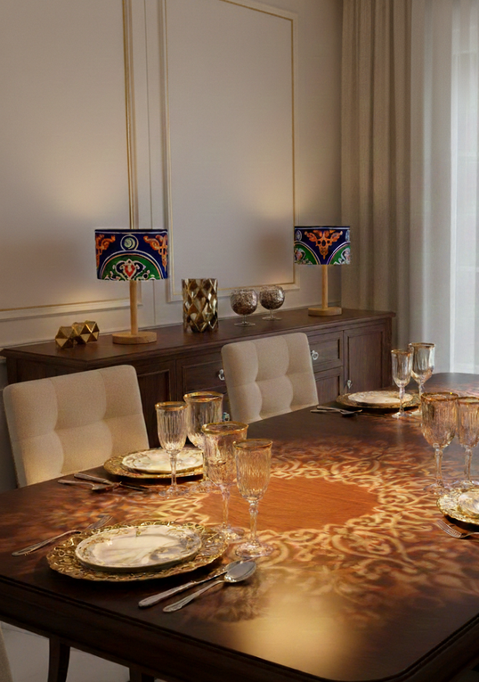 This unique table lamp features a sleek Wooden base paired with a vibrant printed cotton fabric shade inspired by traditional oriental designs. Its bold colors and artistic details make it a standout decorative piece, adding both light and personality to any interior. Perfect for living rooms, bedrooms, or side tables,this lamp blends cultural charm with modern functionality.
