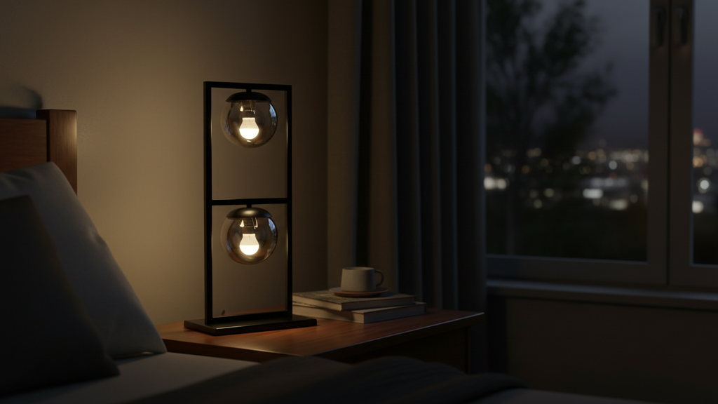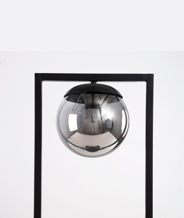 The contemporary table lamp brings a touch of sculptural elegance, crafted from black metal with a matte finish that suits modern and architectural interiors. Providing warm accent lighting, it features a fixed rectangular frame with dual smocked gray glass globes arranged vertically for a symmetrical light spread, powered by two E27 bulbs. Ideal for living rooms, reception desks, or statement shelves, it combines bold design, functionality, and visual balance.