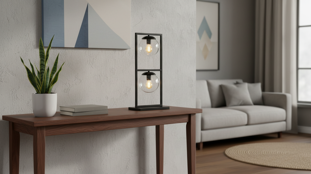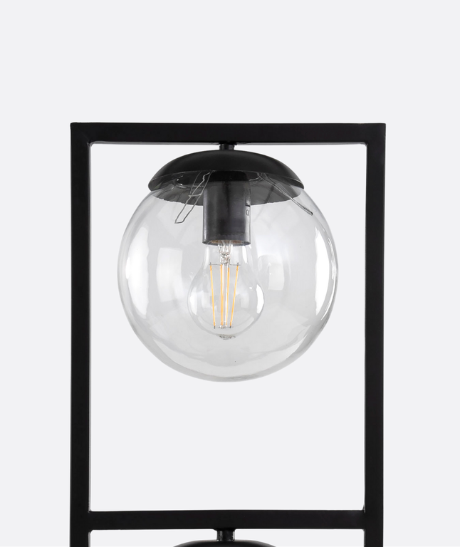 The contemporary table lamp brings a touch of sculptural elegance, crafted from black metal with a matte finish that suits modern and architectural interiors. Providing warm accent lighting, it features a fixed rectangular frame with dual transparent glass globes arranged vertically for a symmetrical light spread, powered by two E27 bulbs. Ideal for living rooms, reception desks, or statement shelves, it combines bold design, functionality, and visual balance.