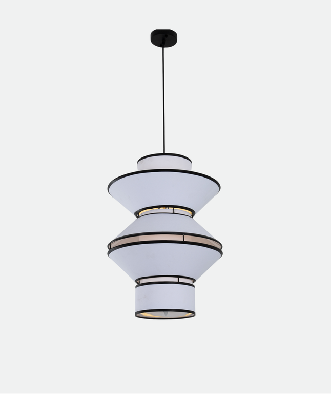 A modern geometric pendant light, suspended from the ceiling by a slim black metal cord attached to a circular black base. The lamp features a series of stacked, inverted conical layers in matte white, each outlined with thin black frames that accentuate the geometric divisions.