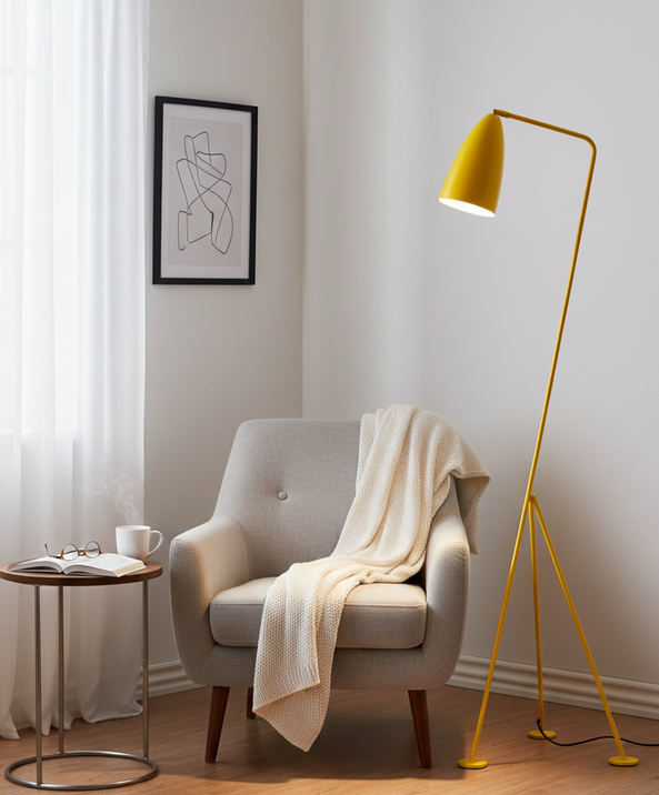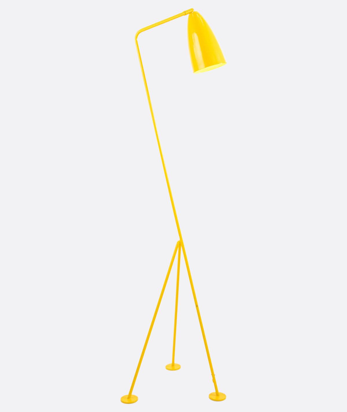 YL-F-234-Y A modern floor lamp with a clean, minimalist design in a matte yellow finish that adds a cheerful touch without overpowering the space. It features a slim tripod base for stability and a downward-facing conical shade, ideal for reading or focused lighting.