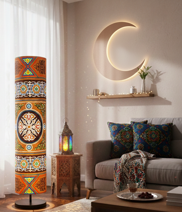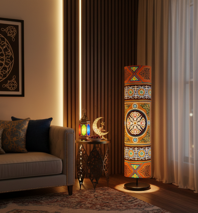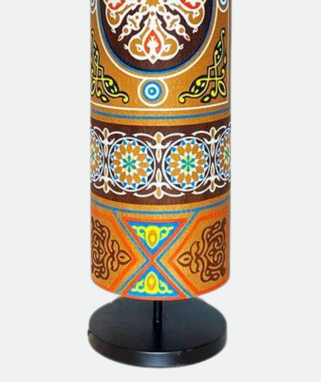 This artistic stand floor lamp features a tall cylindrical cotton supported fabric shade with vibrant oriental patterns, paired with a sleek black metal base. Its bold design brings a unique decorative touch while providing warm lighting, making it perfect for living rooms, bedrooms, or cultural-inspired interiors. A statement piece that combines tradition with modern style.