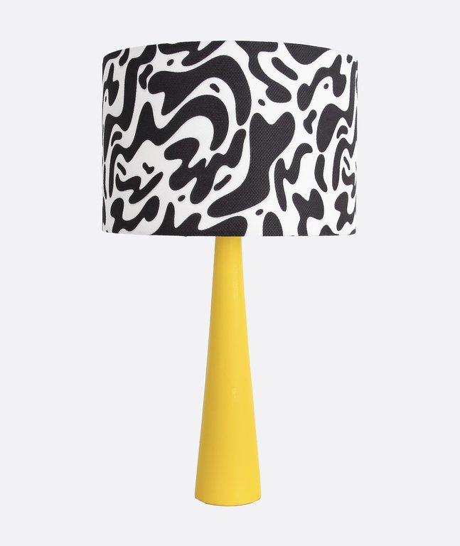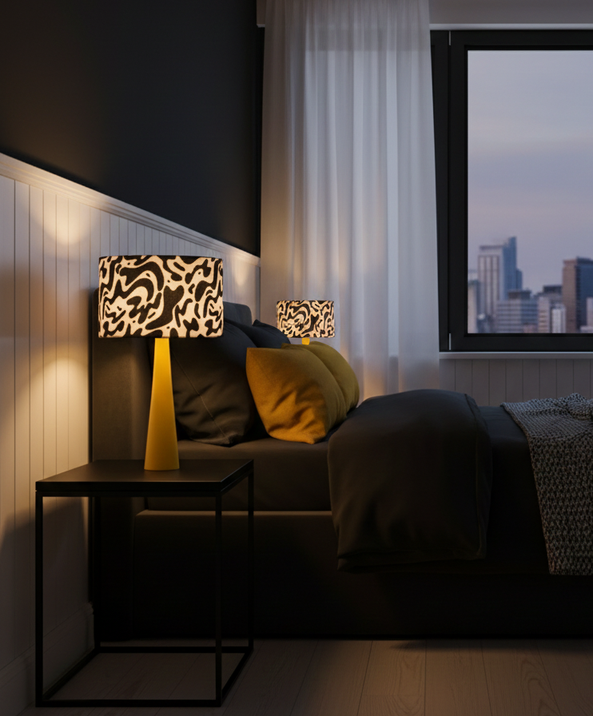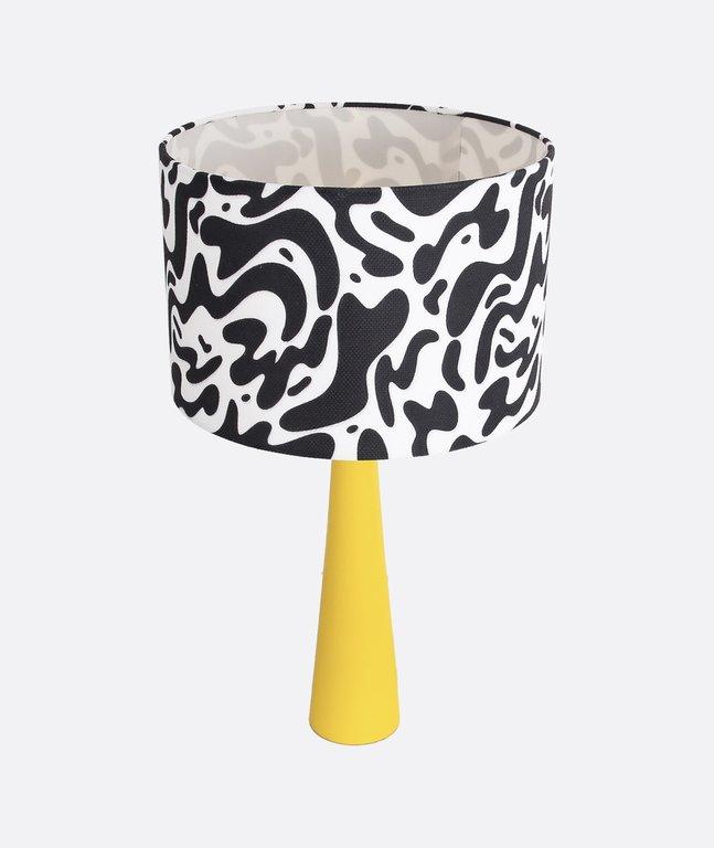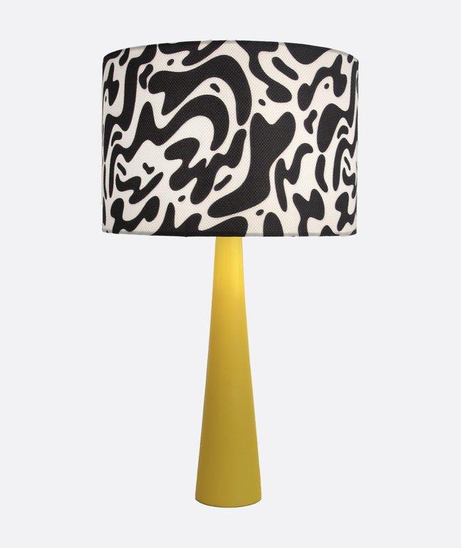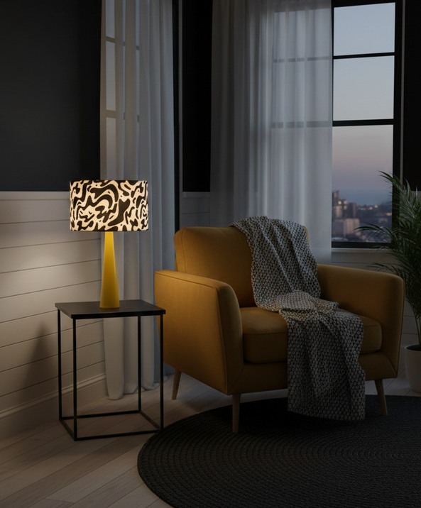 A playful charm and modern locally crafted table lamp, featuring a vibrant printed fabric shade supported by a yellow-finished beech wood cone base. Designed for soft accent lighting, it’s ideal for kids’ rooms, creative workspaces, and colourful commercial interiors. The bold pattern and natural wood texture strike a perfect balance between fun and distinctive , making it a standout piece for modern décor with a youthful twist.