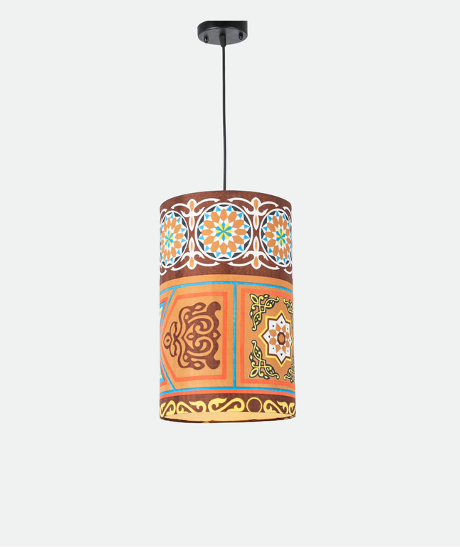 This elegant single Ā pendant light features a tall cylindrical cotton supported fabric shade with vibrant oriental patterns, suspended from a black metal fixture. Designed and made in Egypt, it provides warm and diffused lighting, making it ideal for living rooms, dining spaces, and artistic interiors. A cultural yet modern lighting piece that adds personality to any space.